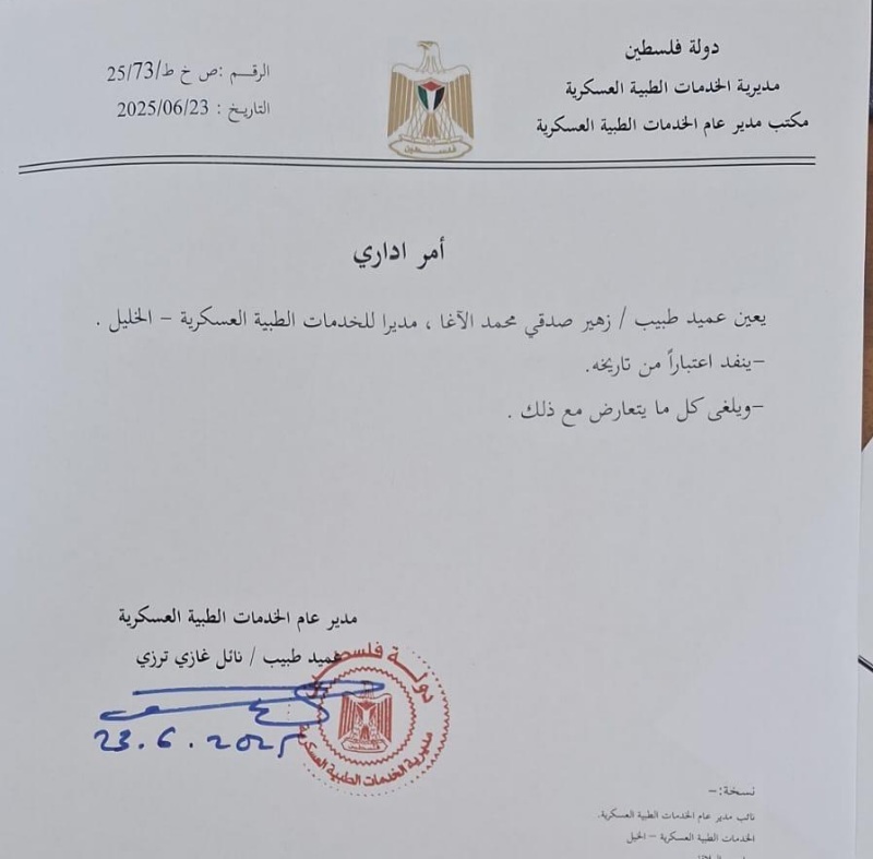 الرئيسة/تعينات وترقيات/تعيين عميد طبيب زهير الأغا مديرا للخدمات الطبية العسكرية- الخليل تعينات وترقيات تعيين عميد طبيب زهير الأغا مديرا للخدمات الطبية العسكرية- الخليل تاريخ النشر : السبت | 06-12-2025 | 16:42 542 اضغط هنا للتواصل أو التعرف على الدكتور زهير صدقي محمد أحمد عثمان الأغا يمكنك تلقي أحدث الأخبار أول بأول بانضمامك لإحدى مجموعات الواتساب الخاصة بالعائلة من خلال الضغط هنـا اظهر المزيد