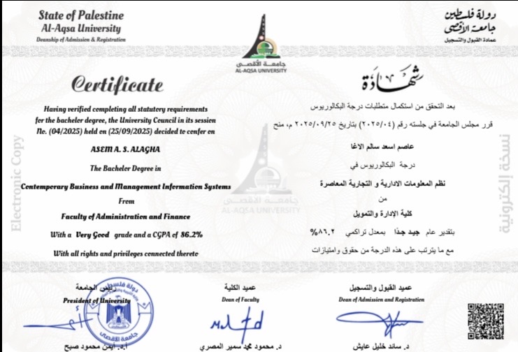 2026-01-10 تم بحمد الله وتوفيقه منح أ. عاصم أسعد سالم مسعود غانم الأغا درجة البكالوريوس تخصص ادارة اعمال من جامعة الأقصى مع أجمل التهاني والأمنيات بالمزيد من التوفيق والسداد والنجاح، سائلين الله عز وجل أن ينتفع به العباد والبلاد.
