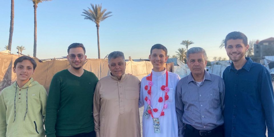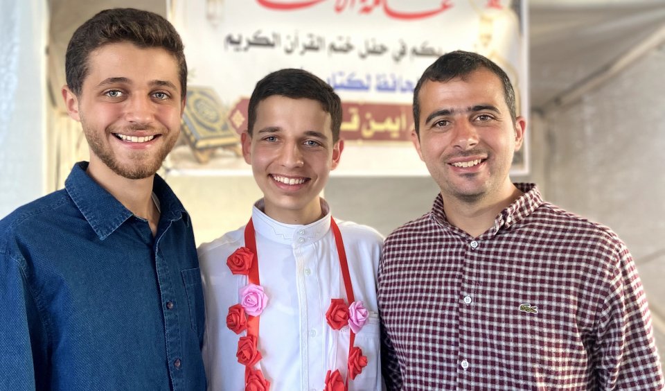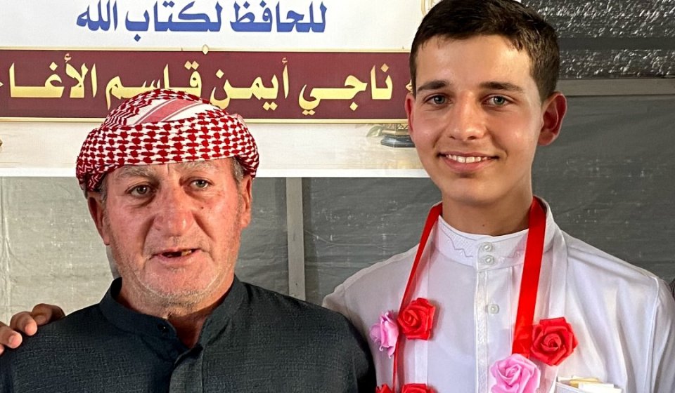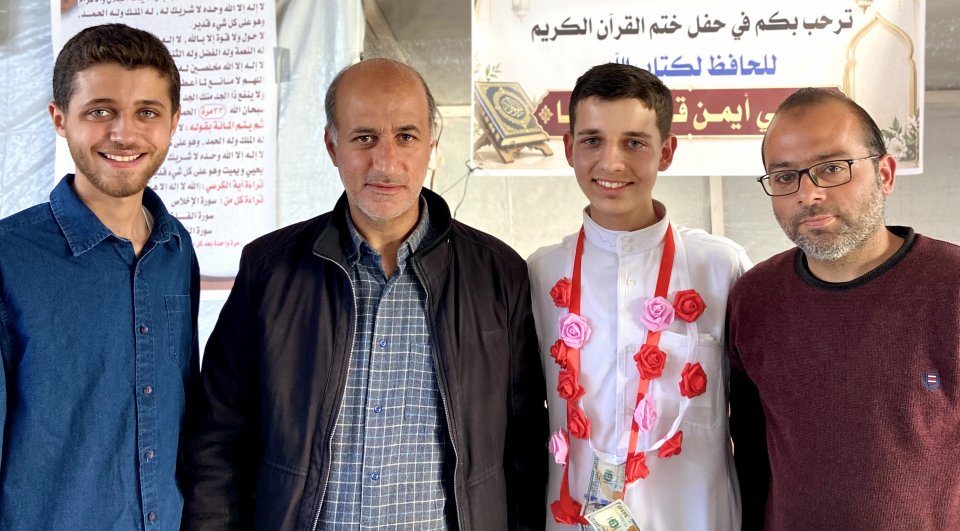 كما نتقدّم بخالص الشكر والتقدير لشيخه ومعلمه الشيخ إبراهيم زهير الأغا، الذي كان له بعد الله الأثر العظيم في هذا الإنجاز، ونبارك لوالديه الكريمين، سائلين الله أن يجزيهما خير الجزاء على دعمهما ودعائهما.. وإلى عمّه الأستاذ ناجي، الذي يحمل اسمه ويفتخر به، فكان الاسم قدوةً والأثر سندًا، جزاه الله خيرًا وبارك فيه.. ونسأل الله الرحمة والمغفرة لمن سبق من أهله وأحبابه، وأن يجعل هذا الإنجاز نورًا يصل إليهم، ورفعةً في درجاتهم.. كما نسأل الله أن يجمعه بأخيه وأحبّته في جنات النعيم، وأن يجعل القرآن شفيعًا لهم جميعًا..
