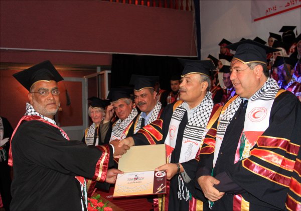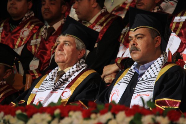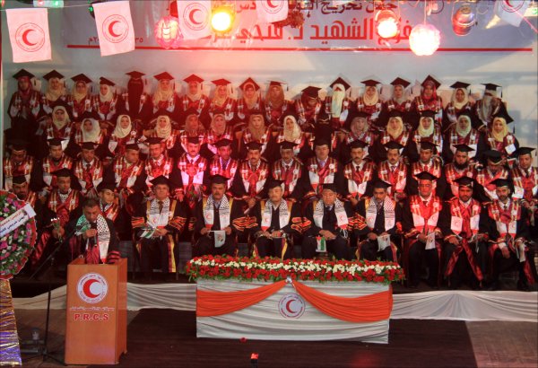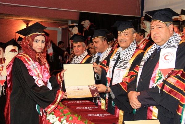 وحضر الاحتفال رئيس جمعية الهلال يونس الخطيب، وعميد الكلية جين كيلدر، وأعضاء الهيئتين التدريسية والإدارية ورؤساء الجامعات والمعاهد، وشخصيات وطنية ووجهاء إلى جانب حشد كبير من ذوي الخريجين. وبدأ الاحتفال بتلاوة آيات عطرة من القرآن الكريم تبعه السلام الوطني الفلسطيني وقراءة الفاتحة على أرواح شهداء فلسطين، وصعد الخريجون من كلا الجنسين إلى منصة الاحتفال يحملون بأيديهم الأعلام الفلسطينية وسط أجواء من الفرحة الكبيرة.