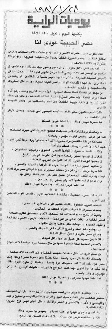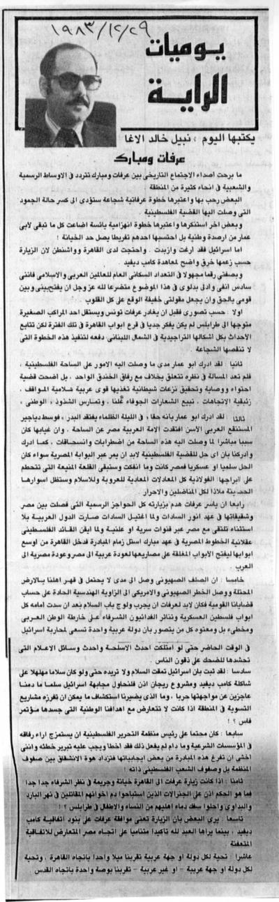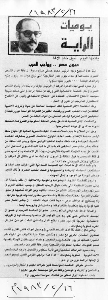 ومقالة سادسة بعنوان: "ديون مصر وواجب العرب" طالبت فيها بضرورة مساهمة العالم العربي في سداد ديون مصر مؤرخة في 16/2/1983، ومقالة مهمة بعنوان: " عرفات ومبارك" مؤرخة بتاريخ 29/12/1983، بمناسبة اول زيارة قام بها الرئيس الراحل الى مصر بهدف كسر المقاطعة العربية الرسمية لها.