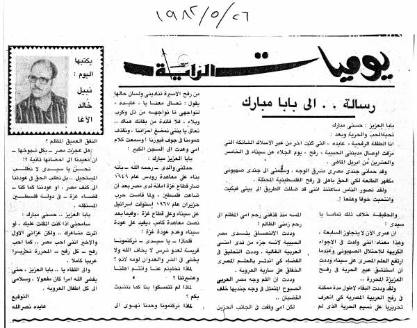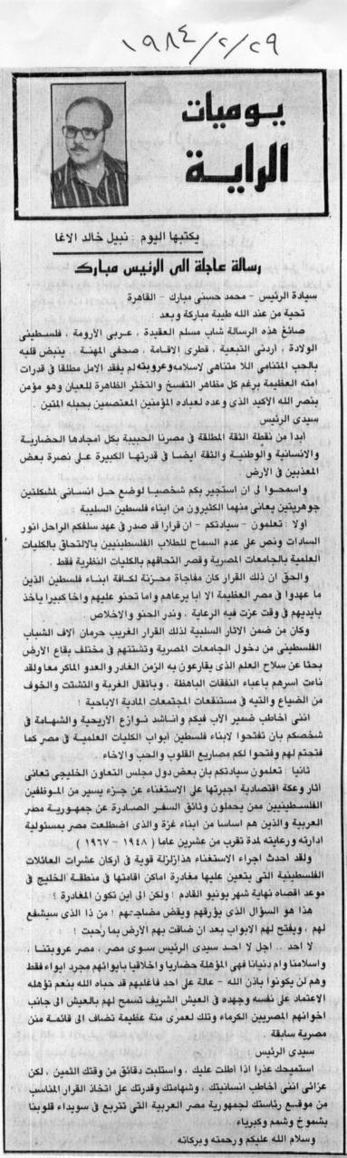 لقد سبق لصائغ هذه الاستغاثة أن بعث لسيادتكم بعدة رسائل منذ نحو ربع قرن على هيئة مقالات تم نشرها في صحيفة «الراية» القطرية إحداها بعنوان: "رسالة عاجلة إلى الرئيس مبارك"، مؤرخة بتاريخ ٢٩/٤/١٩٨٤م، ورسالة ثانية بعنوان:"رسالة الى الرئيس مبارك"مؤرخة في 5/1/1983 ، ورسالة ثالثة بلسان فتاة فلسطينية بعنوان: "رسالة إلى بابا مبارك" مؤرخة في 26/5/1982، ورسالة رابعة بعنوان: "مصر الحبيبة عودي لنا" مؤرخة بتاريخ ٢٨/١٠/١٩٨١ متضمنة مناشدة مصر بالعودة إلى أحضان العرب الذين قاطعوها لإقامتها صلحاً منفرداً مع إسرائيل!.