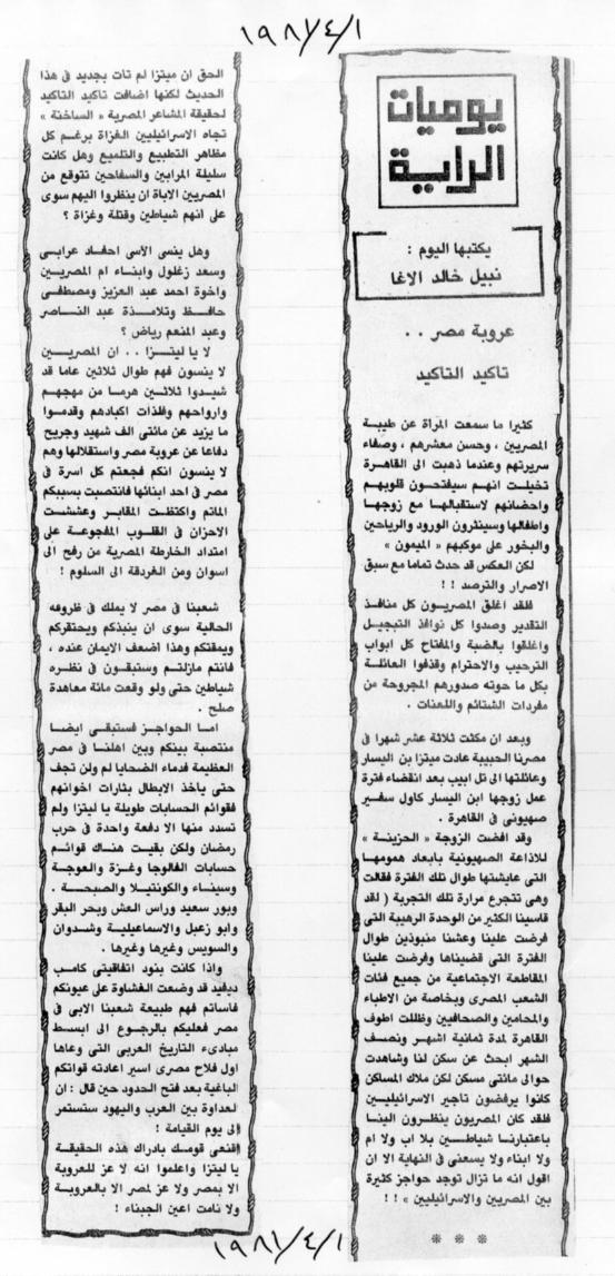 ومقالة خامسة بعنوان: "عروبة مصر.. تأكيد التأكيد" نشرت بتاريخ ١/٤/١٩٨١، وورد في أسطرها الأخيرة حرفياً «انه لا عز للعروبة إلا بمصر، ولا عز لمصر إلا بالعروبة، ولا نامت أعين الجبناء».