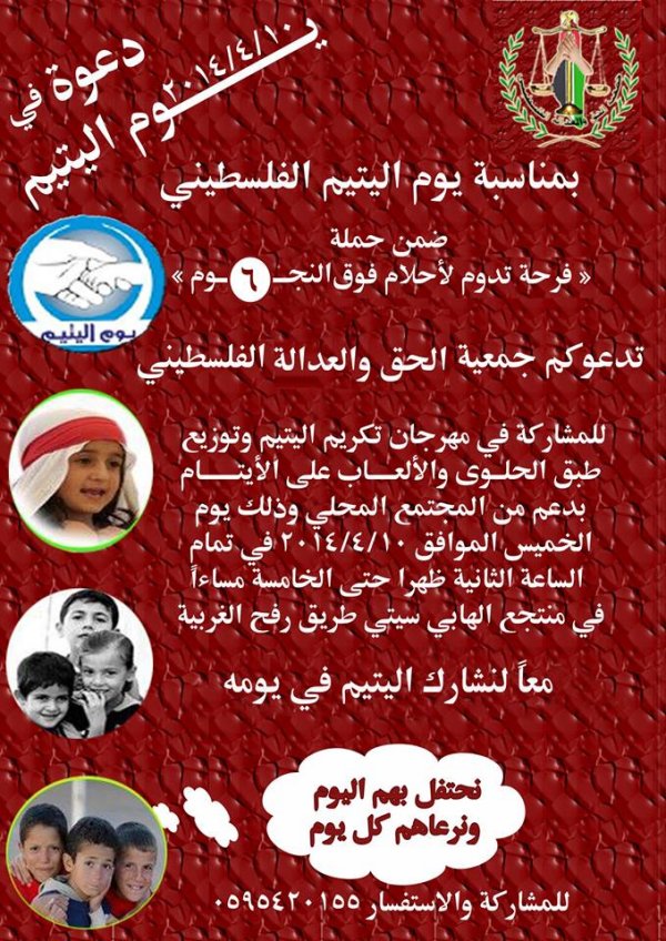 الرئيسة/متفرقات/دعوة للمشاركة والمساهمة في يوم اليتيم الفلسطيني متفرقات دعوة للمشاركة والمساهمة في يوم اليتيم الفلسطيني تاريخ النشر : الخميس | 13-03-2014 | 19:43 5905 (وَيُطْعِمُونَ الطَّعَامَ عَلَى حُبِّهِ مِسْكِينًا وَيَتِيمًا وَأَسِيرًا) لمزيد من الإستفسار ياسر جوال 0599302285 يمكنك تلقي أحدث الأخبار أول بأول بانضمامك لإحدى مجموعات الواتساب الخاصة بالعائلة من خلال الضغط هنـا اظهر المزيد