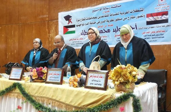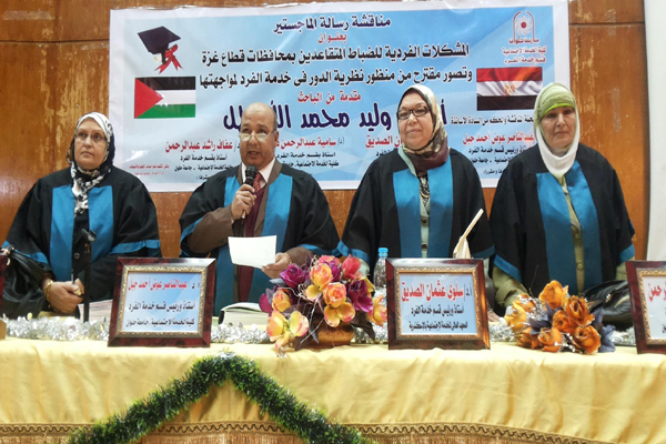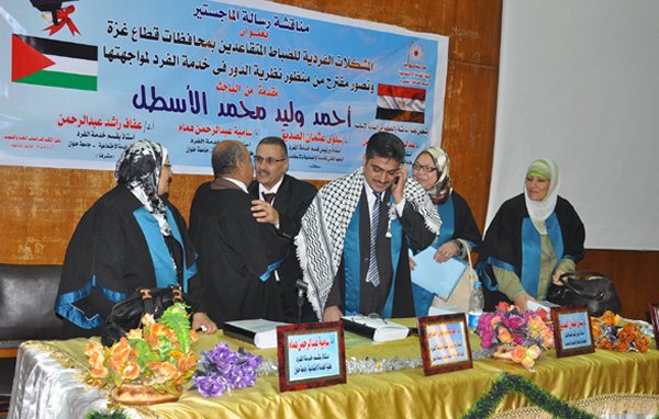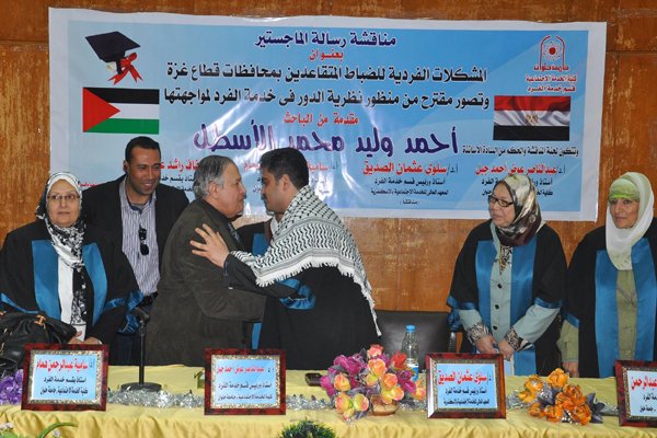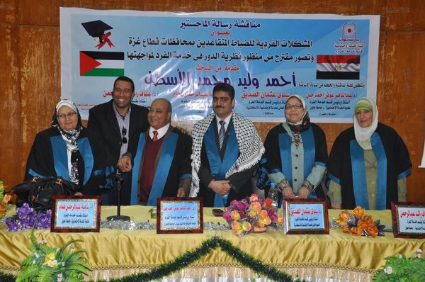 القاهرة- جامعة حلوان- السبت الموافق 15-03-2014 حصول الباحث أ.أحمد وليد محمد الأسطل على درجة الماجستير في الخدمة الاجتماعية- قسم خدمة فرد- بتقدير عام امتياز مع مرتبة الشرف الأولى، وذلك بعد مناقشة رسالته التي كانت بعنوان: “االمشكلات الفردية للضباط المتقاعدين بمحافظات قطاع غزة وتصور مقترح من منظور نظرية الدور في خدمة الفرد لمواجهتها”
