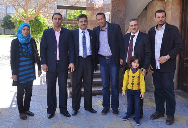 الباحث يتوسط لجنة المناقشة وصديقه د. اياد الكحلوت