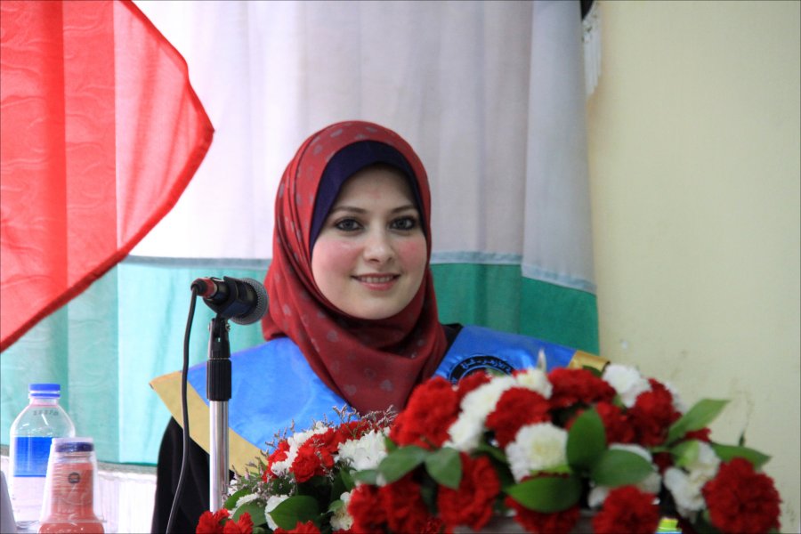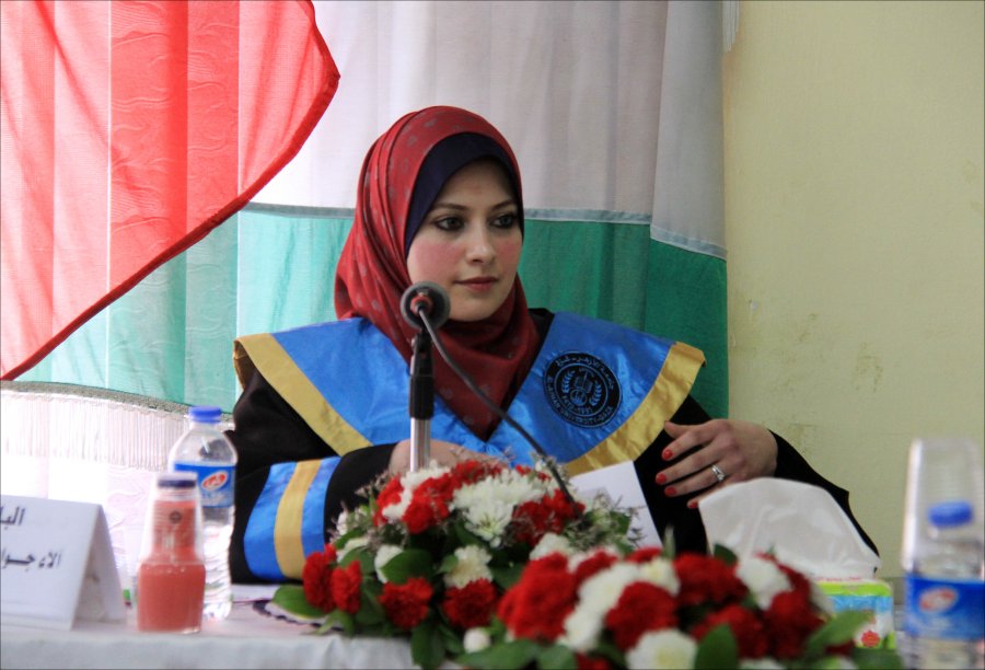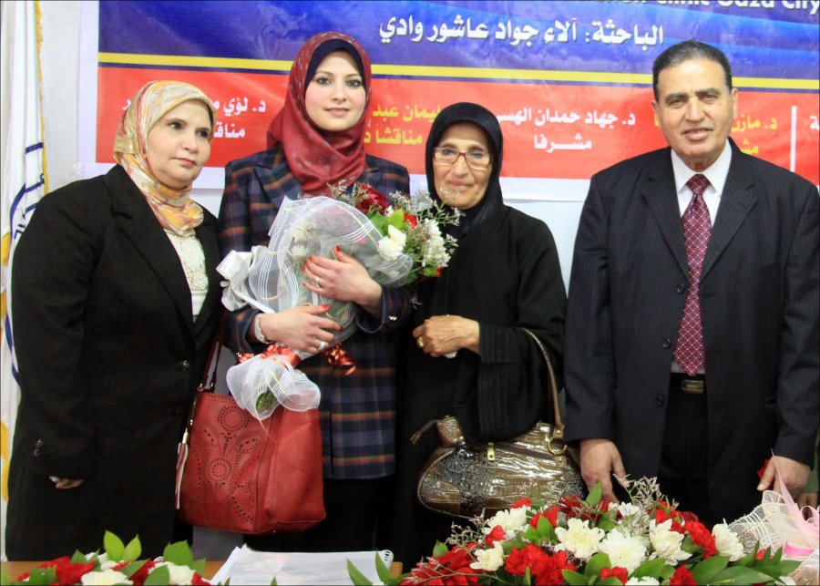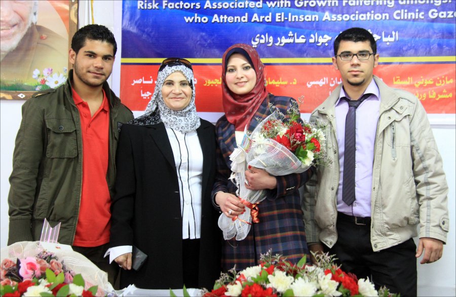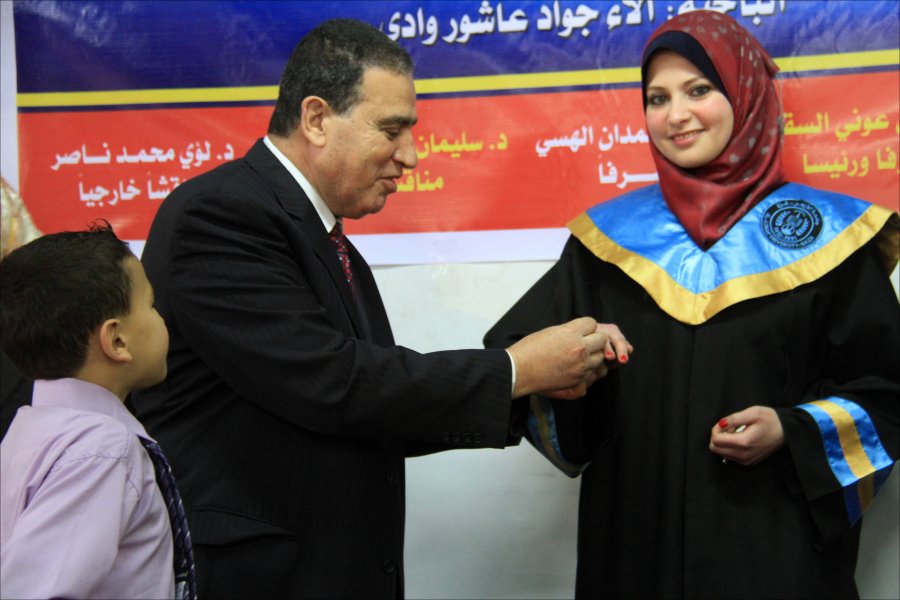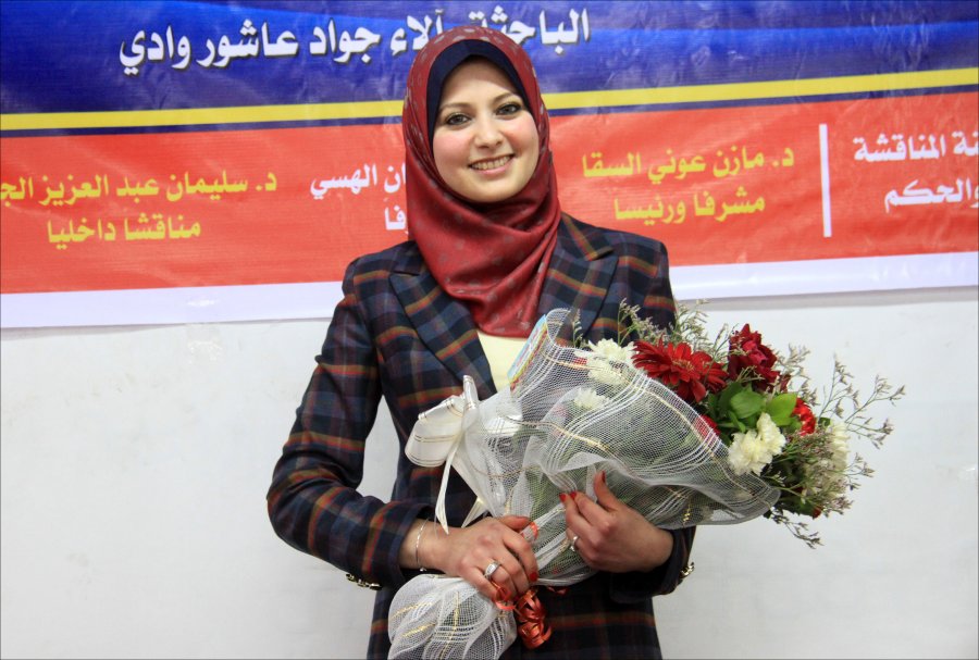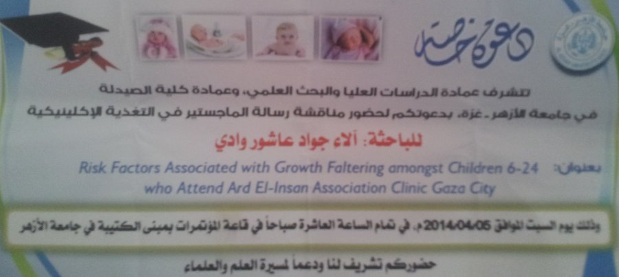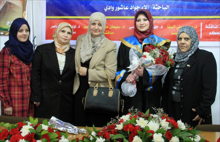 قاعة المؤتمرات الكتيبة جامعة الأزهر بغزة- السبت الموافق 05-04-2014 نالت الدكتورة الصيدلانية ألاء جواد عاشور وادي حرم الدكتور أسامة محمد قاسم محمد الأغا درجة الماجستير، في التغذية الإكلينيكية بكلية الصيدلة بعد اجتيازها بحث التخرج بعنوان: