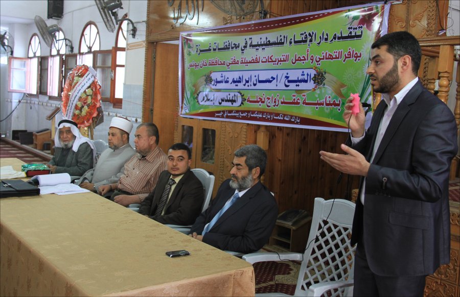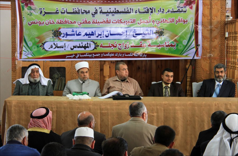 المركز الإسلامي- مسجد إم سالم- السطر الشرقي- خان يونس- الجمعة الموافق 11-04-2014، عقد قران م. إسلام إحسان إبراهيم عاشور، إلى صاحبة الصون والعفاف الآنسة هند فراس محمد موسى الأسطل، وألف مبارك.