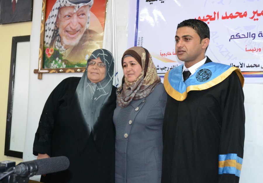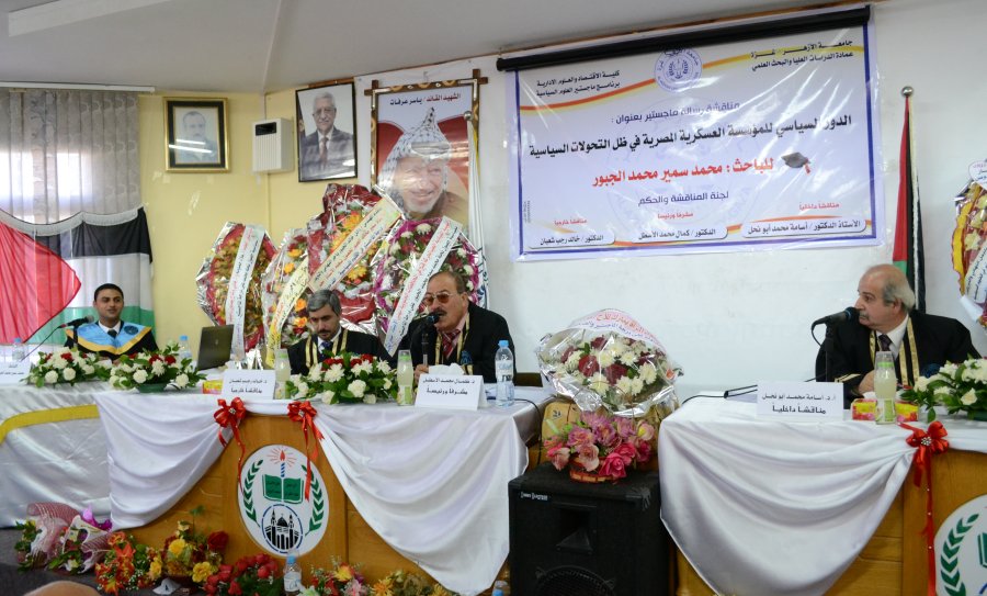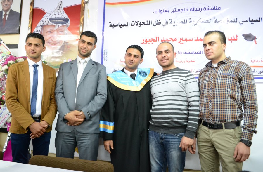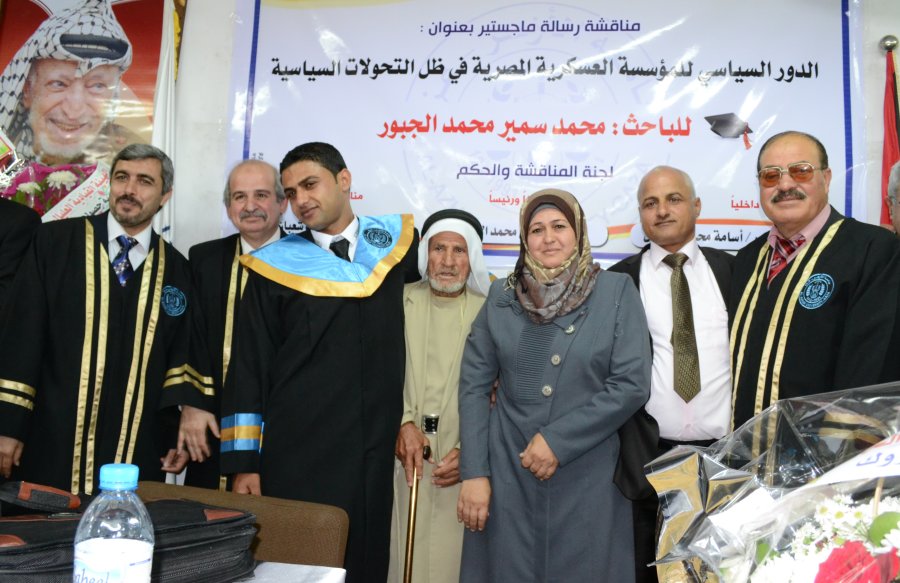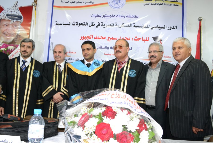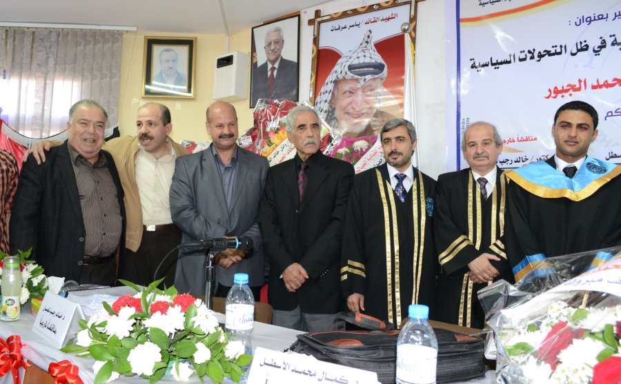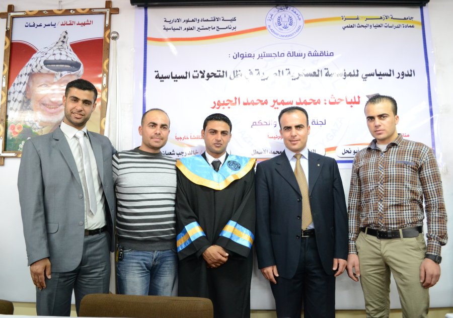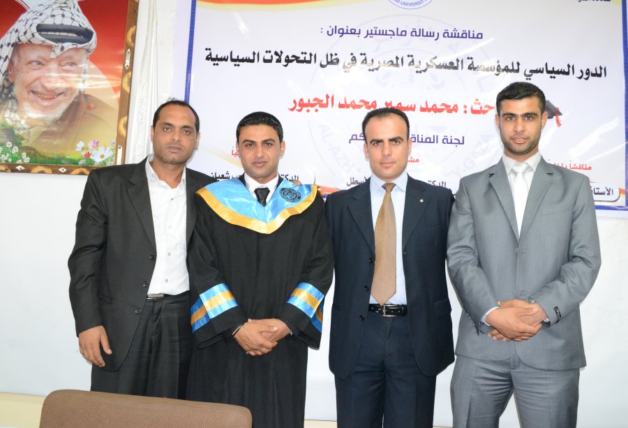 قاعة المؤتمرات الكتيبة جامعة الأزهر بغزة- الثلاثاء الموافق 22-04-2014 نال الباحث محمد سمير محمد الجبور درجة الماجستير، في العلوم السياسية بكلية الإقتصاد والعلوم الإدارية بعد اجتيازه بحث التخرج بعنوان: