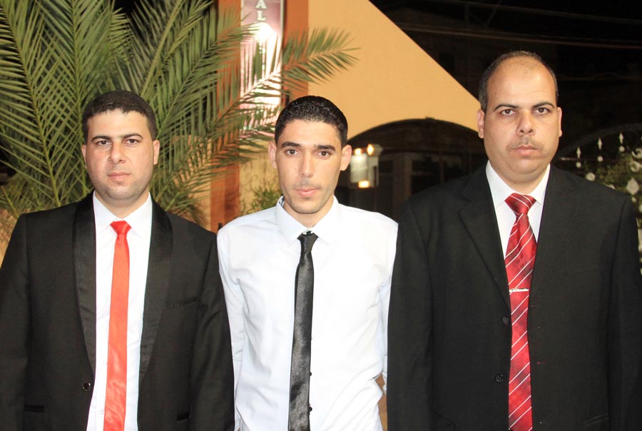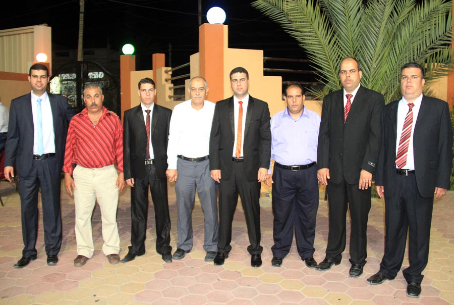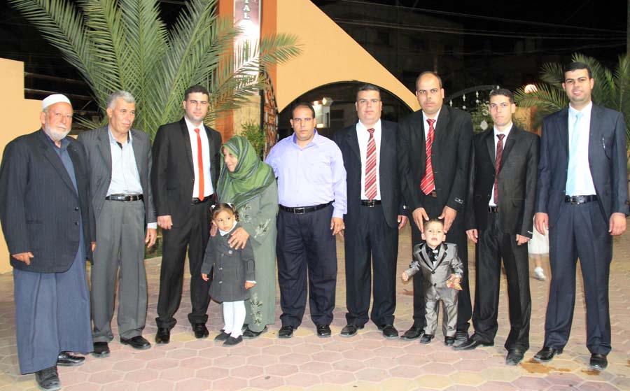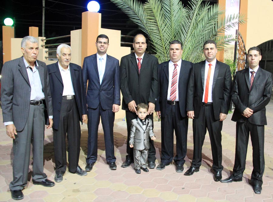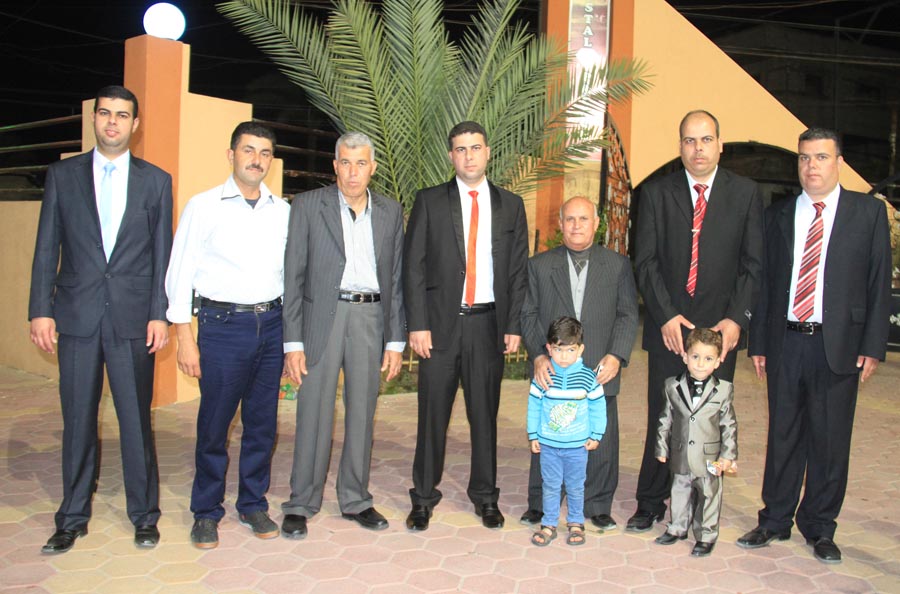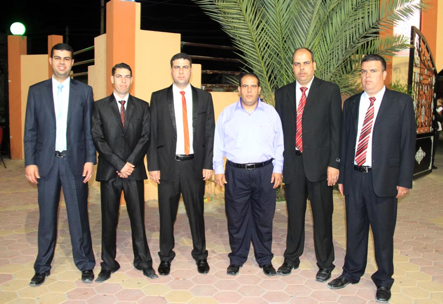 ا. مؤمن، أ. عمر(شقيق العريس)، أ. إسماعيل عيد الأغا(زوج شقيقة العريس)، ..، العريس، والد العروس، عديل العريس،