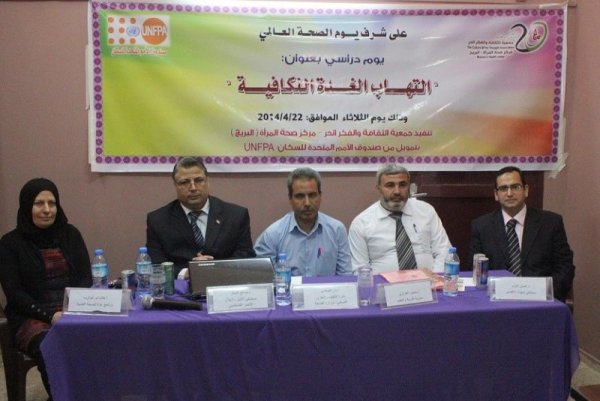 نظم مركز صحة المرأة التابع لجمعية الثقافة والفكر الحر يوما دراسيا حمل عنوان " التهاب الغدة النكافية "،وذلك ضمن حملته التوعوية للحد من انتشار الملرض وطرق العلاج والوقاية منه ،وذلك على شرف يوم الصحة العالمى ،وبتمويل من صندوق الامم المتحدة للسكان.