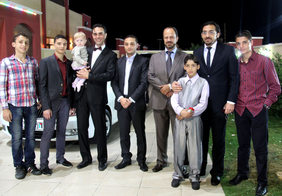 أ. إياد أبوشقرة(زوج شقيقة العريس)، د. أحمد القدرة، أ. إياد(شقيق العريس)، العريس، والد العروس، أ. عبدالله، م. عمرو، سليمان(أشقاء العروس)