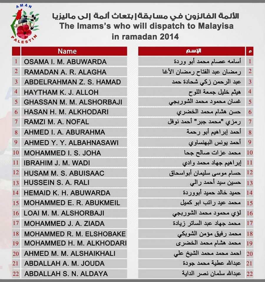 الأئمة الفائزون في مسابقة إبتعاث أئمة إلى ماليزيا، شهر رمضان 2014م، ومن ضمنهم أ. رمضان عبدالفتاح الأغا