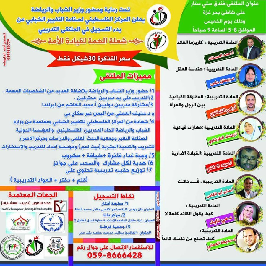 تعلن المؤسسة الدولية لصناعة التغييرللتسجيل للملتقى الشبابي، مع نخبة من أبرز المدربين المحترفين في قطاع غزة، وبإعتماد من مؤسسات تدريبية دولية رائدة في التنمية الذي سيعقد من الساعة التاسعة صباحاً لحتى الساعة الرابعة عصراً، يوم الخميس الموافق 8-5-2014م، في فندق سيتي ستار على شاطيء بحر غزة.