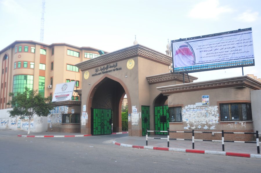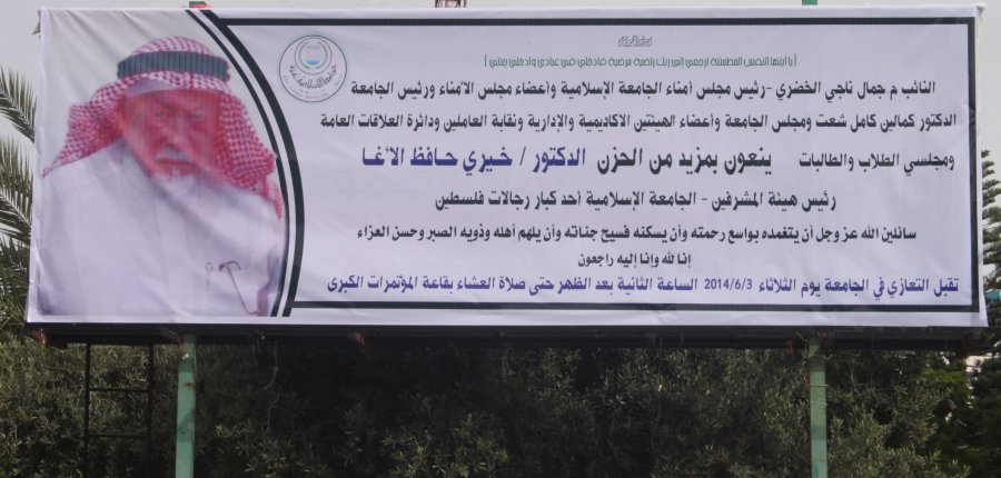 مدخل الجامعة الإسلامية ومعلق عليه بوستر النعي للدكتور وعميد العائلة خيري الأغا