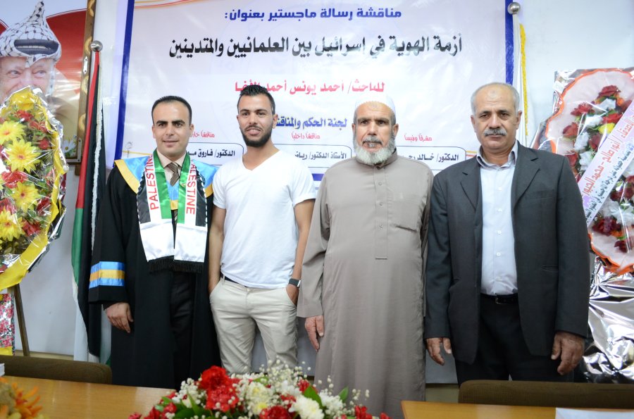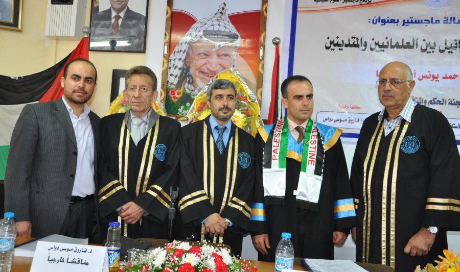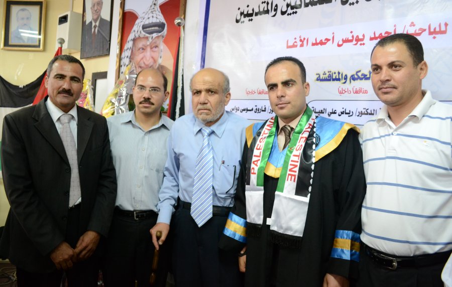 بعد تلاوة الحكم: أ.د. رياض العيلة، د. مروان سليم الاغا، الباحث، د. خالد شعبان، د. فاروق دواس
