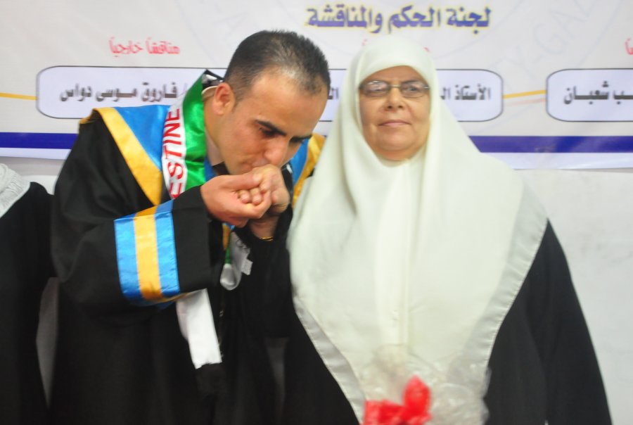 الباحث يقبل يد والدته الحاجة ام عصام الاغا