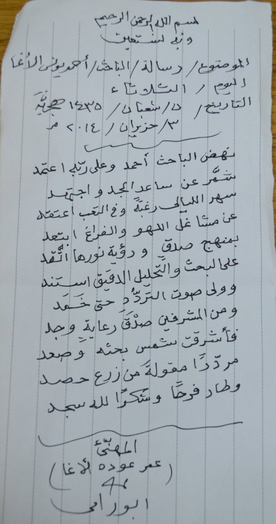 المشرف مهنئاً ومثمناً على جهد الباحث