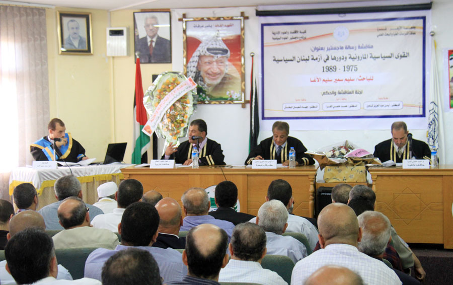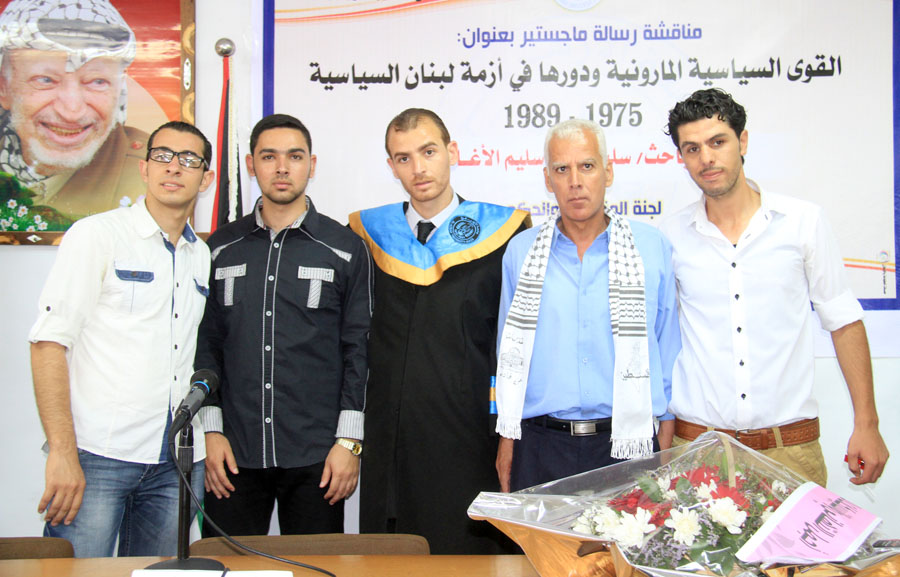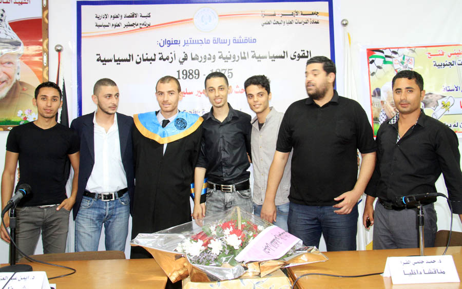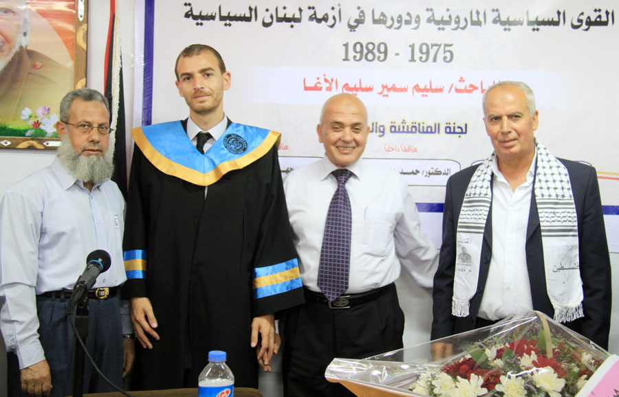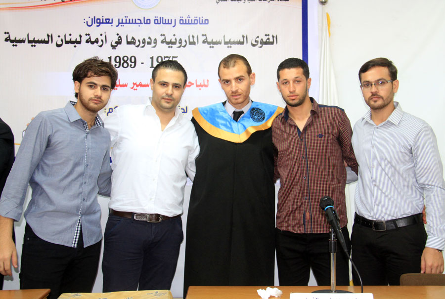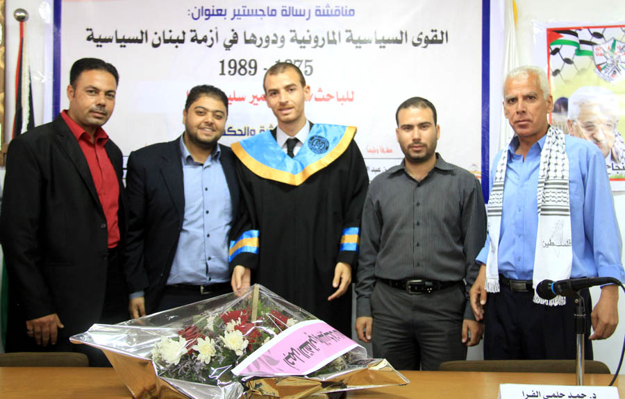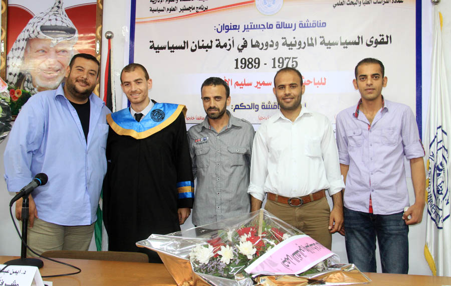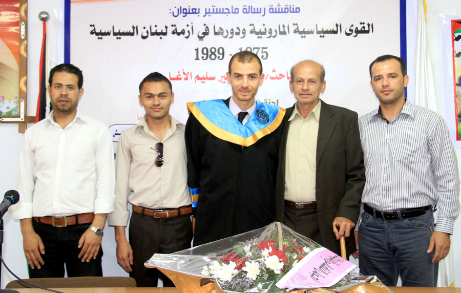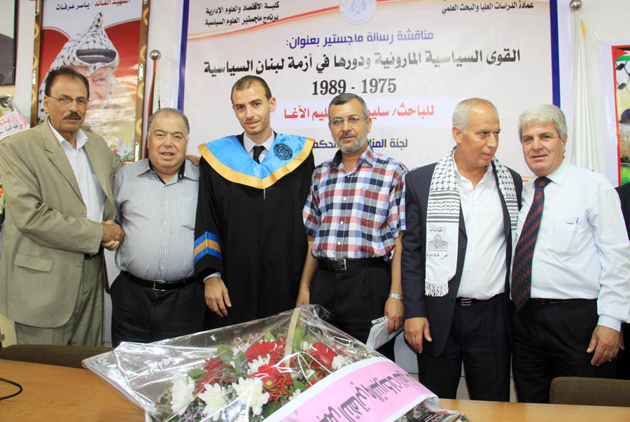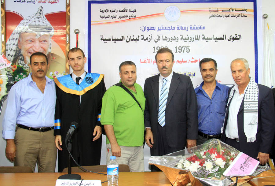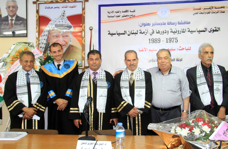 قاعة المؤتمرات الكتيبة جامعة الأزهر بغزة- الثلاثاء الموافق 17-06-2014 نال الباحث سليم سمير سليم الأغا درجة الماجستير، في العلوم السياسية بكلية الاقتصاد والعلوم الادارية بعد اجتيازه أطروحة الماجستير والموسومة بعنوان القوى السياسية المارونية ودورها في أزمة لبنان السياسية 1975-1989 وقد تكونت لجنة الحكم والمناقشة من د. أيمن عبدالعزيز شاهين (مشرفاً ورئيساً)، د. حمد كامل الفرا(مناقشاً داخلياً)، د. جهاد شعبان البطش(مناقشاً خارجياً). وقد أوصت اللجنة المشرفة بقبول الرسالة بدرجة امتياز ونشرها و تطويرها لنيل درجة الدكتوراه.