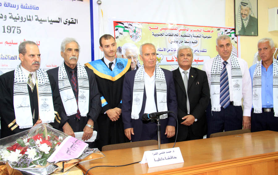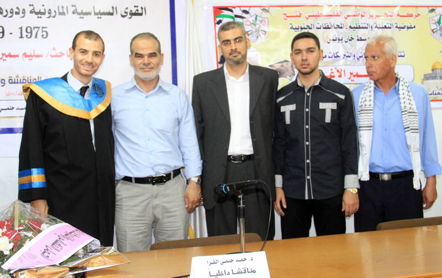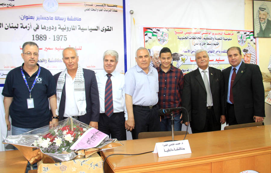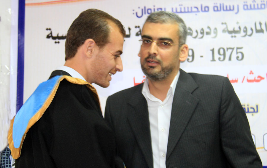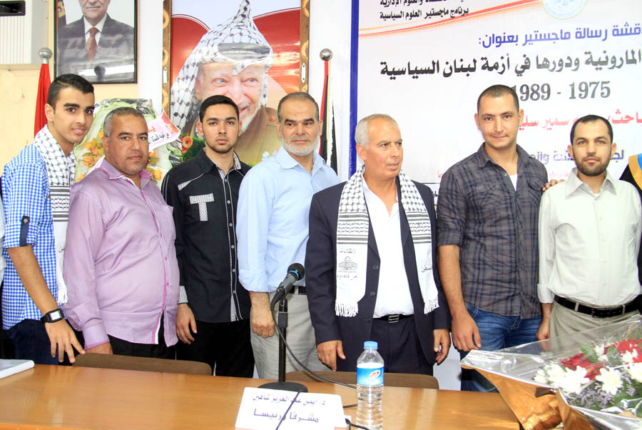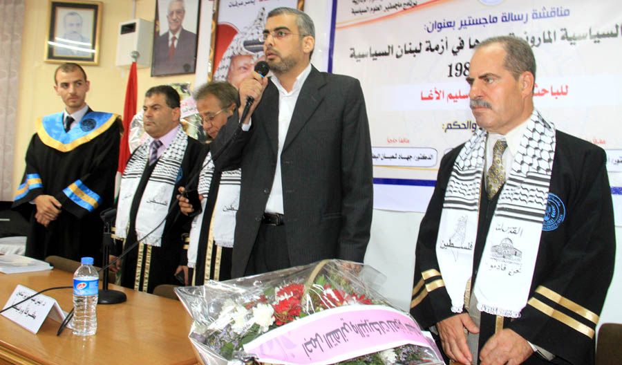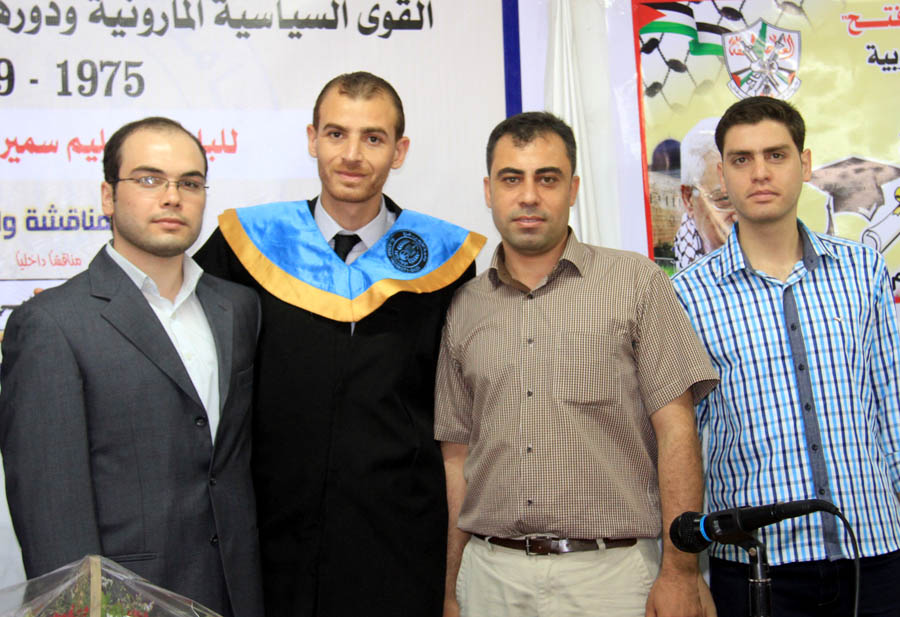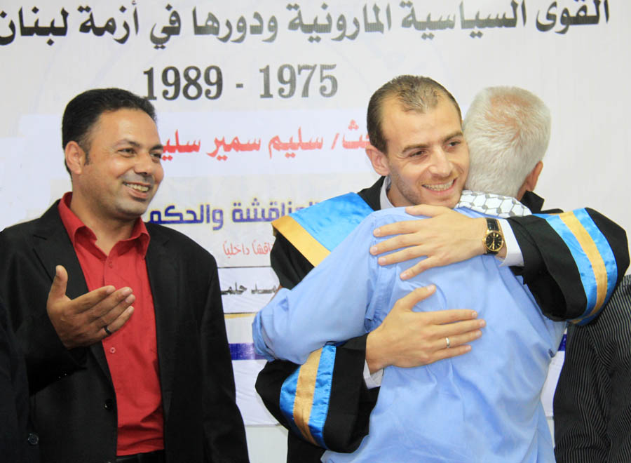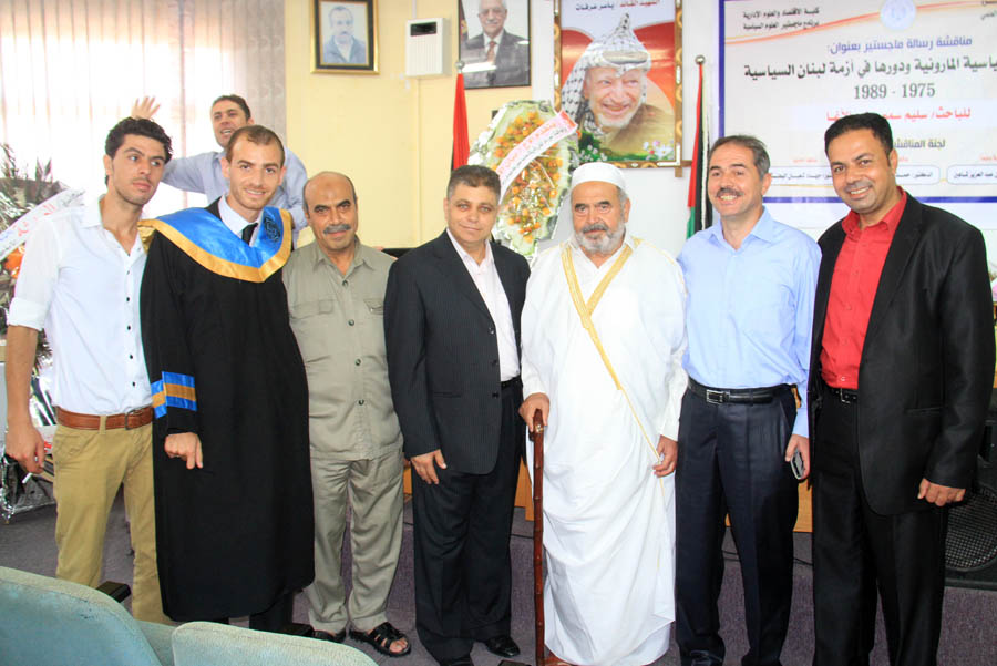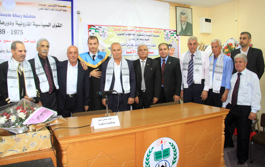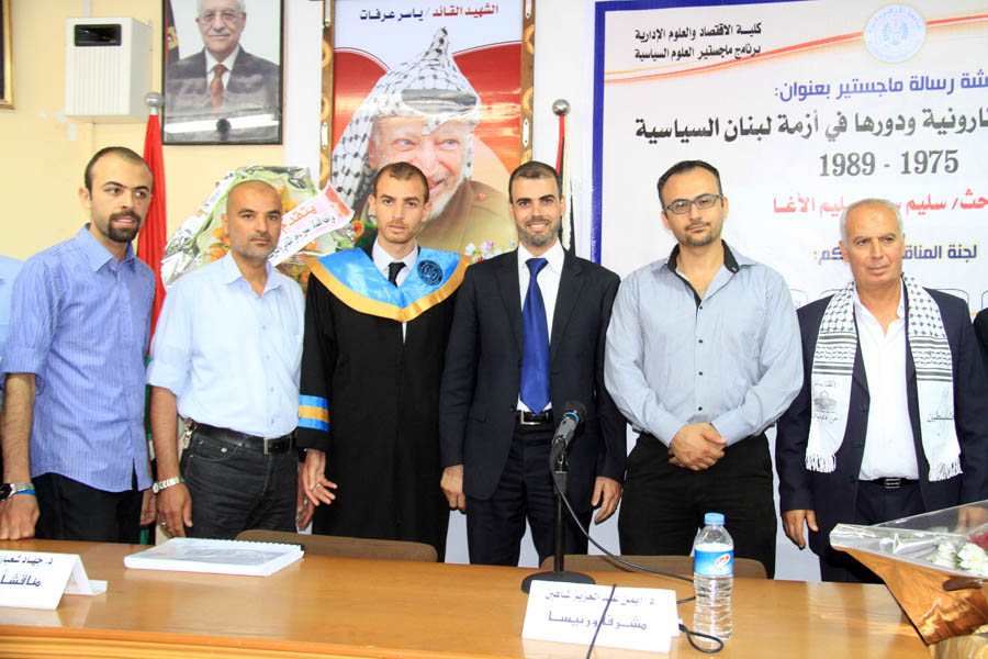 قاعة المؤتمرات الكتيبة جامعة الأزهر بغزة- الثلاثاء الموافق 17-06-2014 نال الباحث سليم سمير سليم الأغا درجة الماجستير، في العلوم السياسية بكلية الاقتصاد والعلوم الادارية بعد اجتيازه أطروحة الماجستير والموسومة بعنوان القوى السياسية المارونية ودورها في أزمة لبنان السياسية 1975-1989 وقد تكونت لجنة الحكم والمناقشة من د. أيمن عبدالعزيز شاهين (مشرفاً ورئيساً)، د. حمد كامل الفرا(مناقشاً داخلياً)، د. جهاد شعبان البطش(مناقشاً خارجياً). وقد أوصت اللجنة المشرفة بقبول الرسالة بدرجة امتياز ونشرها و تطويرها لنيل درجة الدكتوراه.