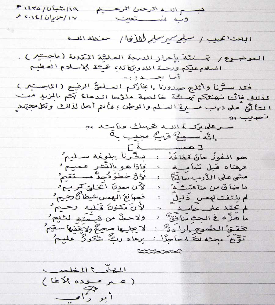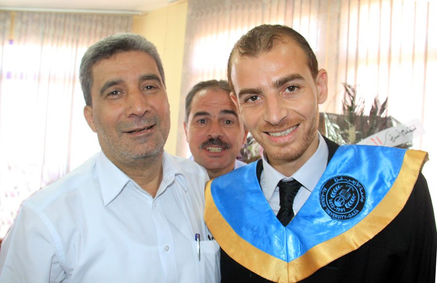 أ. منير، أ. بيان(عما الباحث)، د. سلام زكريا الأغأ، الباحث ووالده، أ. إبراهيم أبو النجا، د. حمد الفرا
