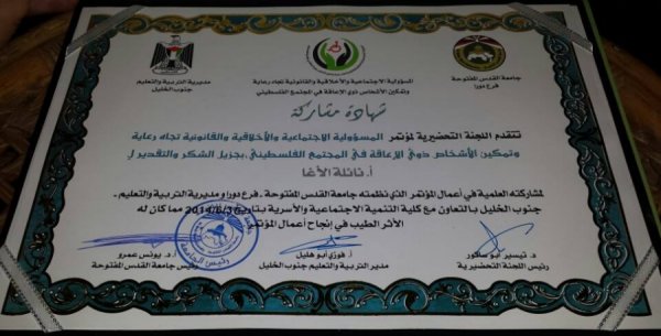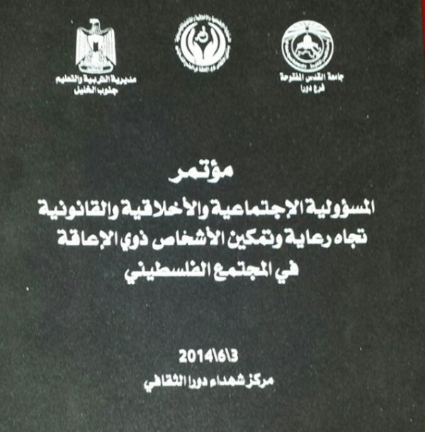 مشاركة أ. نائلة خليل الأغا فى مؤتمر المسؤولية الاجتماعية والأخلاقية والقانونية تجاه رعاية وتمكين الأشخاص ذوى الإعاقة فى المجتمع الفلسطينى بجامعة القدس المفتوحة فرع دورا بالخليل تحت رعاية أ.د يونس عمر رئيس جامعة القدس المفتوحة شاركت ببحث علمى بعنوان " تمكين المرأة الكفيفة فى المجتمع الفلسطينى " دراسة على عينة من المؤسسات الراعية للمرأة الفلسطينية فى قطاع غزة".