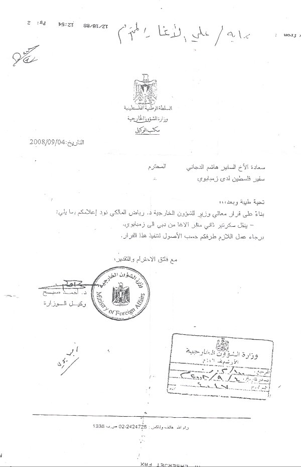 تم ترقية السيد : منار يوسف الاغا الى درجة سكرتير ثاني في البعثة الدبلوماسية في سفارة فلسطين لدى دولة زيمبابوى وينقل إلى من البعثة الدبلوماسية من قنصيلة فلسطين بدبى إلى البعثة الدبلوماسية بسفارة فلسطين فى دولة زيمبابوى ... وألف مبارك