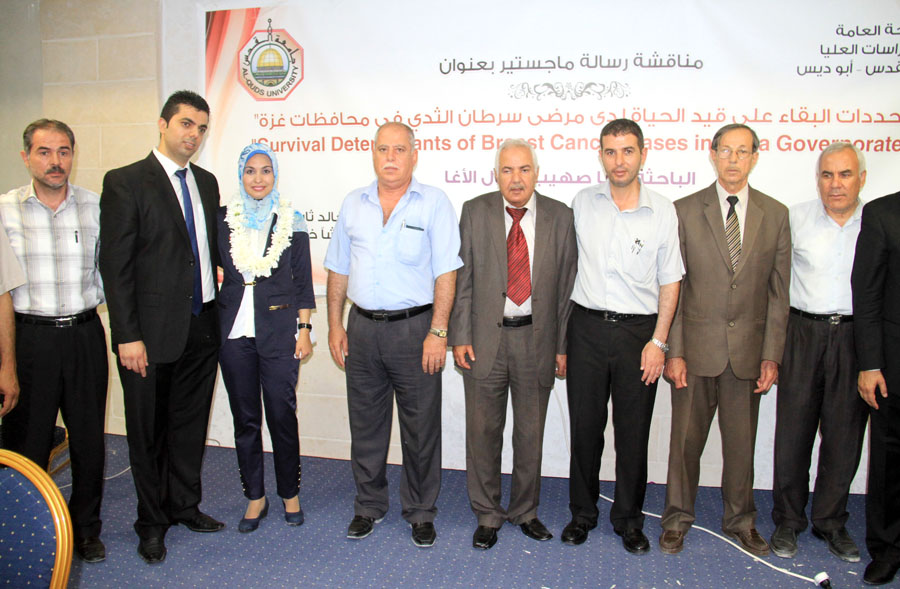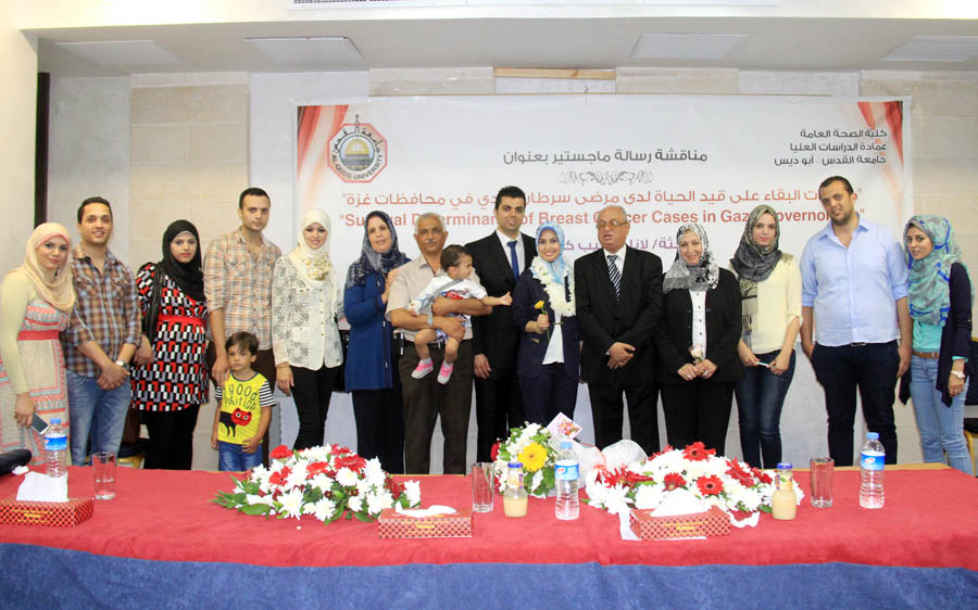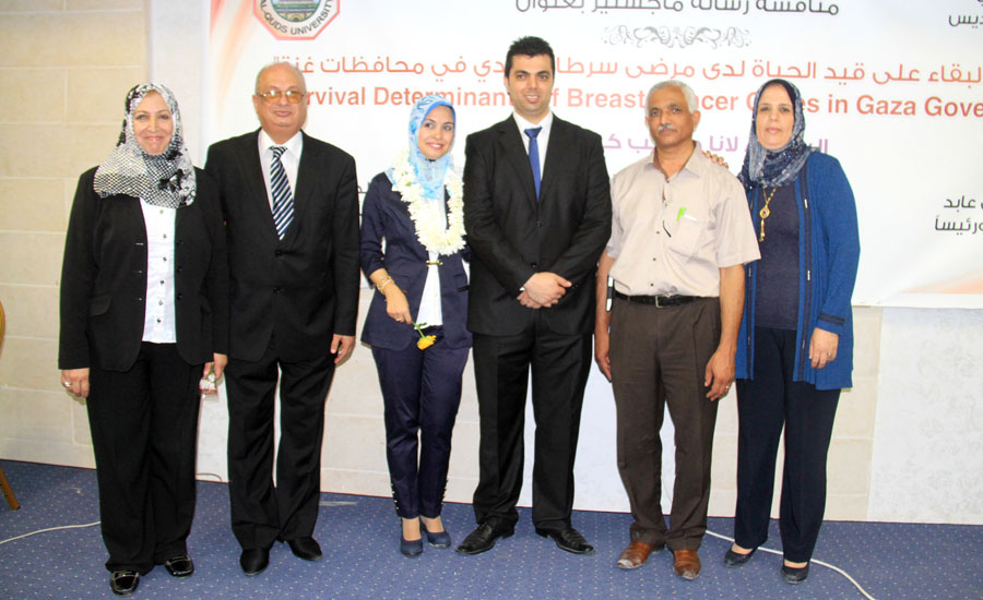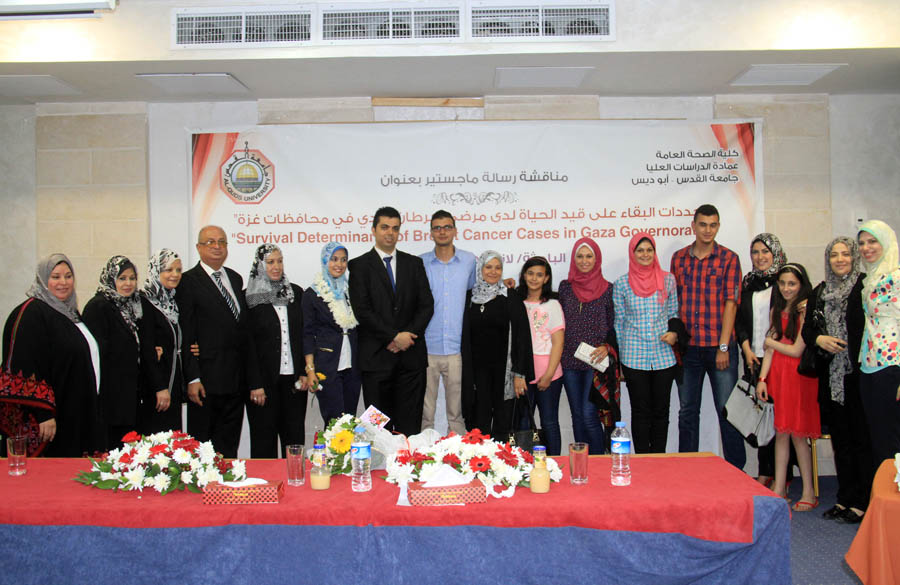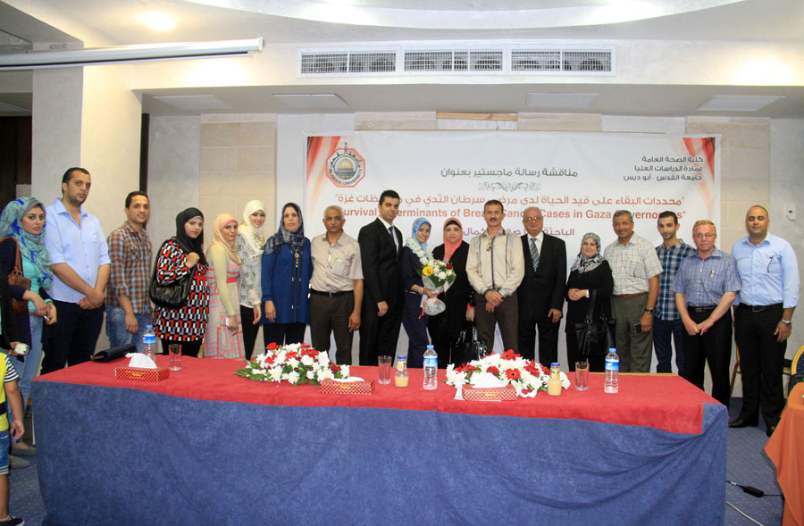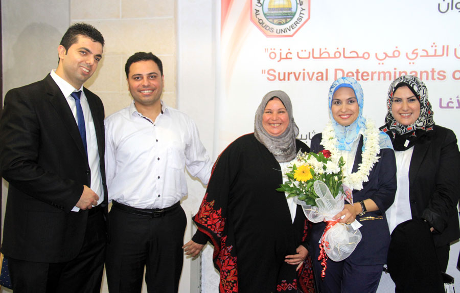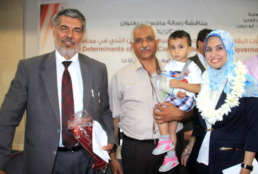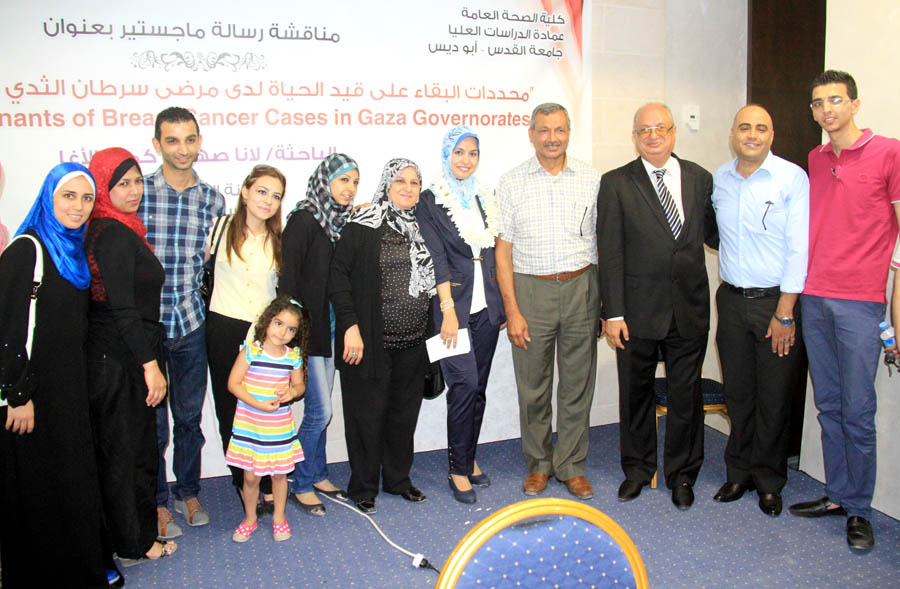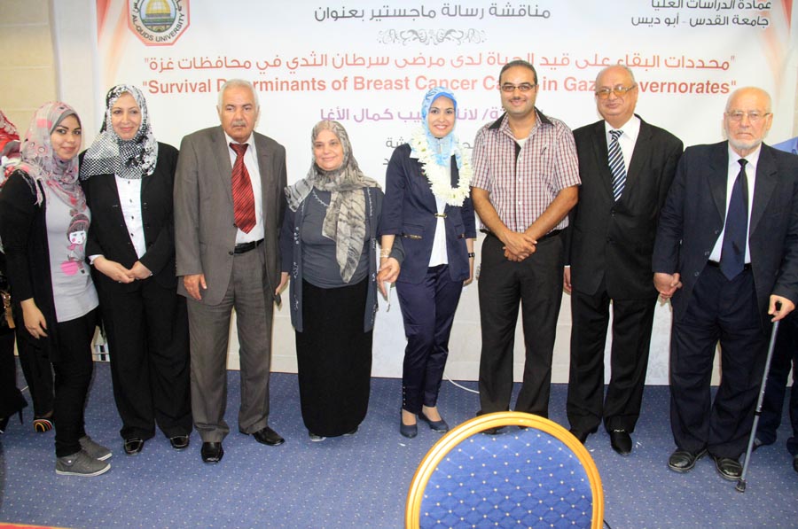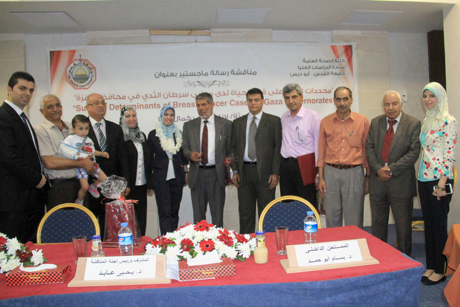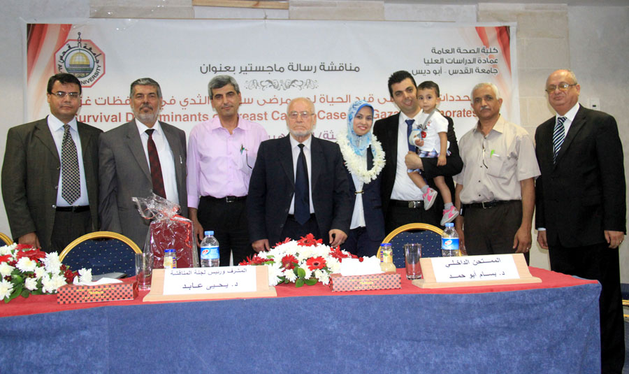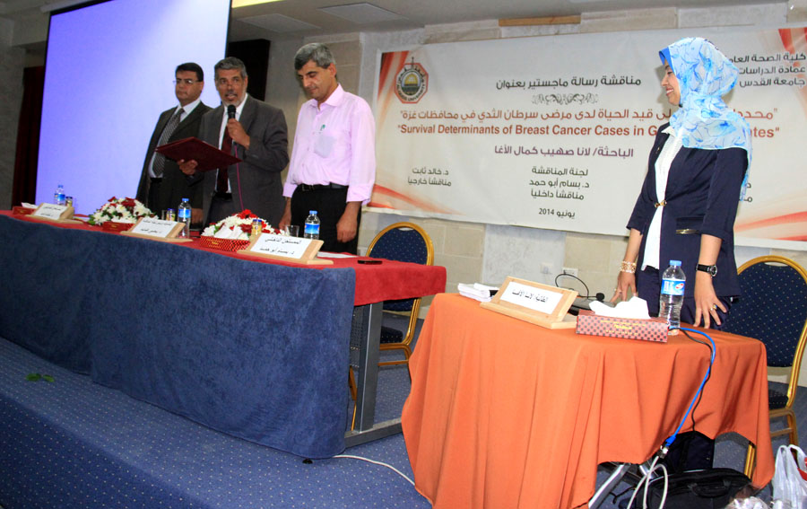 وأجرت الدراسة الباحثة لانا صهيب كمال الأغا للحصول على درجة الماجستير من كلية الصحة العامة – جامعة القدس- أبو ديس وتمت المناقشة بحضور لجنة الحكم والمناقشة د.يحيى عابد مشرفا ورئيسا، د.بسام أبو حمد الممتحن الداخلي، د.خالد ثابت الممتحن الخارجي ووزيرة شؤون المرأة د.هيفاء الأغا ووالد الباحثة د.صهيب الأغا ووالدتها د.ردينة الشوا والعشرات من الأساتذة والمعنيين وأقارب وأصدقاء الباحثة.