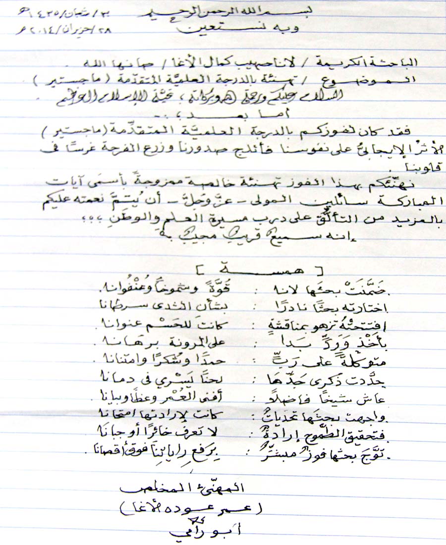 محمد أرسلان الأغا، أ. محمد(شقيق الباحثة)، والد الباحثة، أ. عبدالكريم صقر الأغا، أ. ياسر كمال الأغا، الباحثة وزوجها