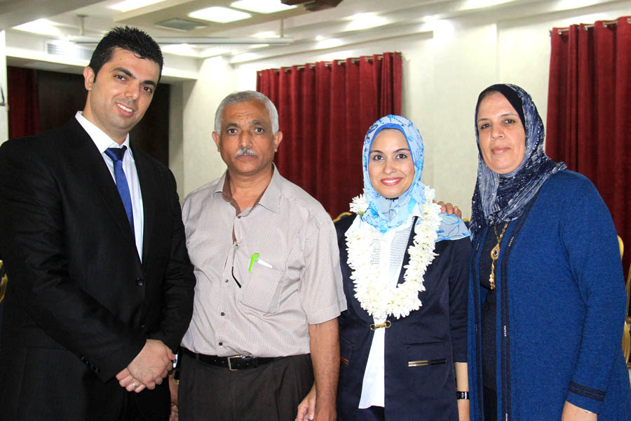 م. آلاء(شقيقة الباحثة)، د. ردينة الشوا(والدة الباحثة)، الباحثة، د. صهيب كمال الاغا(والد الباحثة)، أ. محمد(شقيق الباحثة)