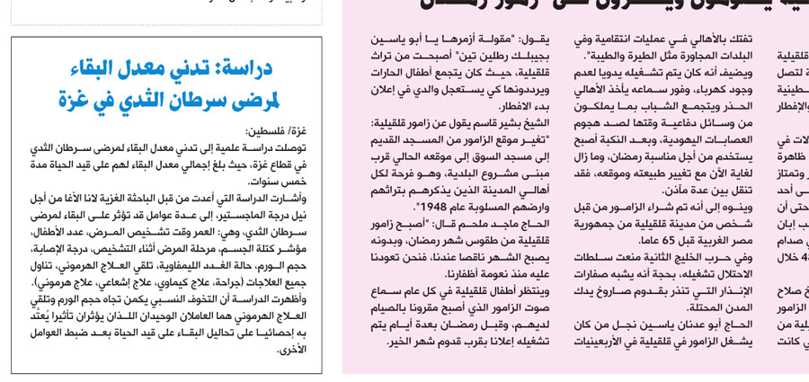 أكدت الدراسة تدني معدل البقاء لمرضى سرطان الثدي في قطاع غزة حيث بلغ إجمالي معدل البقاء على قيد الحياة لمدة خمس سنوات وفق كابلان ماير 53.4%.