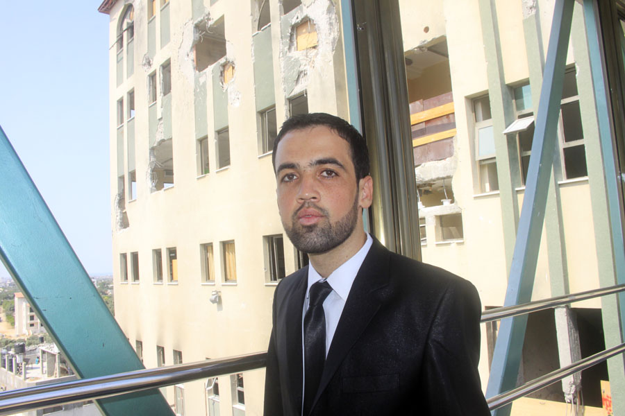 شاكر منتصر ويبدو في الخلف آثار القصف الإسرائيلي على الكلية الجامعية خلال الحرب على غزة 2014شاكر منتصر الأغا، عماد عمر أبو صبره، عبدالرحمن مصطفى منصور، وسام مصطفى الشوربجي، هاني عبدالحميد اللحام