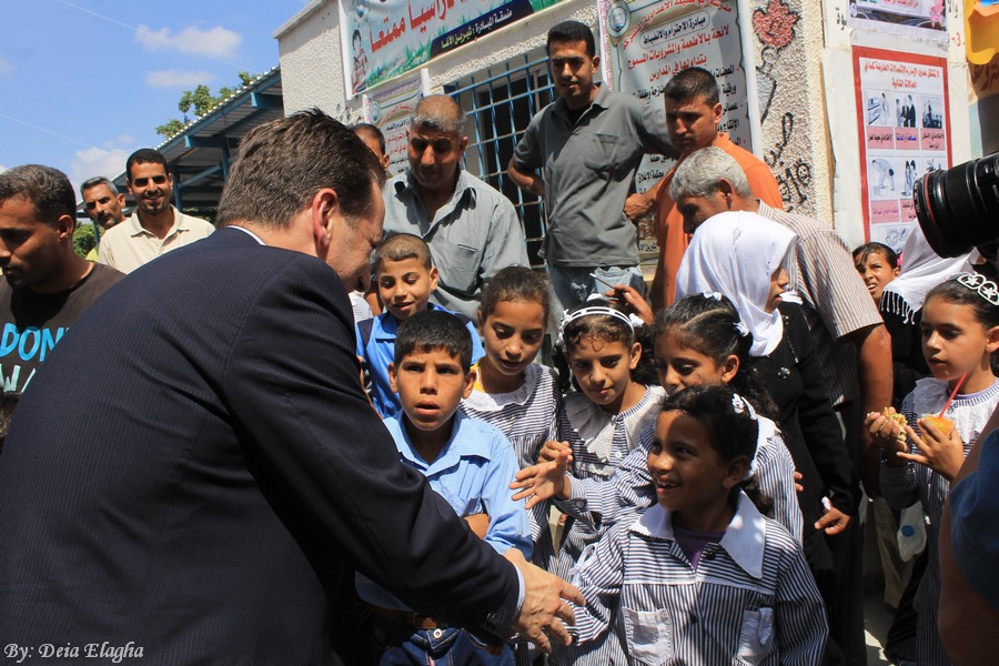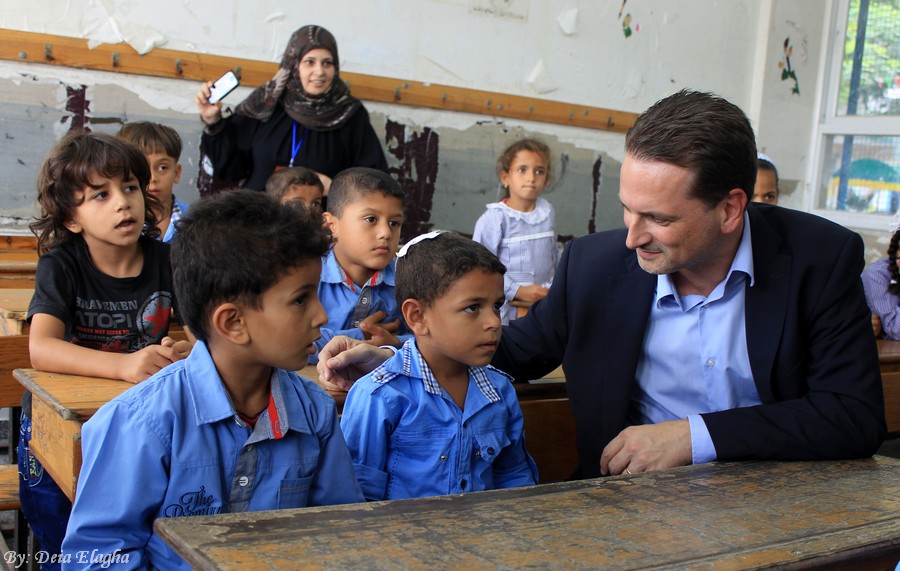 المفوض العام لوكالة غوث وتشغيل اللاجئين الفلسطينيين "أونروا"، بيير كرينيول يداعب أحد تلاميذ منطقة شرق خانيونس