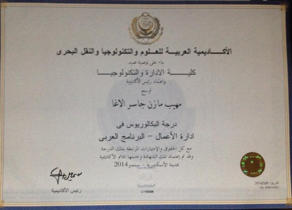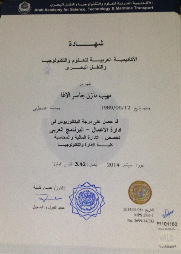 الإسكندرية- تخرج الطالب مهيب مازن جاسر الأغا، في الاكاديمية العربية للعلوم والتكنولوجيا والنقل البحري، التخصص ادارة مالية ومحاسبة ، بتقدير ممتاز، وألف مبارك.