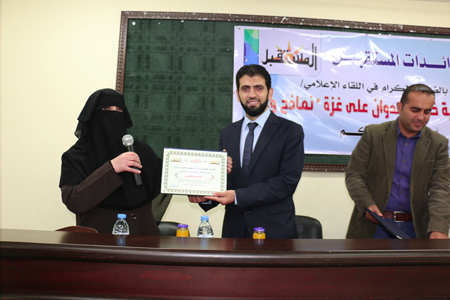 ورحبت مديرة الجمعية أ. أم بلال شبير بالضيوف الكرام، وشكرتهم على دورهم الرائع في التغطية، ومخاطرتهم بحياتهم لإيصال صورة الوضع أبان الحرب.