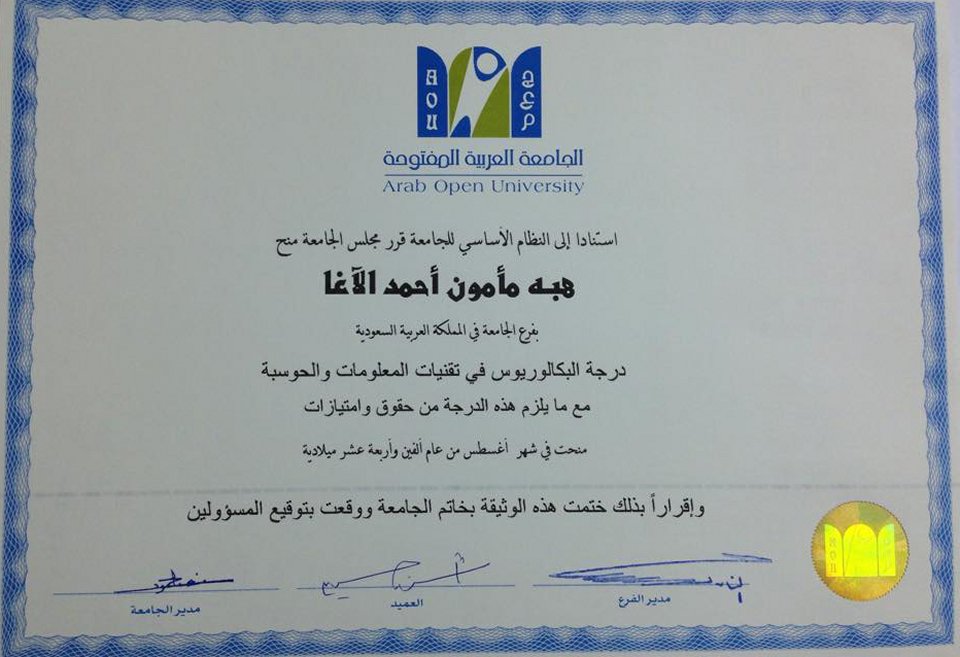 جدة- تخرج الطالبة هبة مأمون أحمد حاسي الأغا، في الجامعة العربية المفتوحة، قسم التقنيات المحوسبة، وألف مبارك