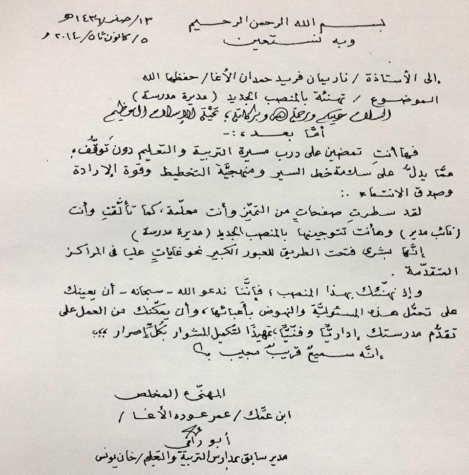 الرئيسة/نشاط/تهنئة بالمنصب الجديد للأستاذة ناريمان فريد الأغا نشاط تهنئة بالمنصب الجديد للأستاذة ناريمان فريد الأغا تاريخ النشر : الثلاثاء | 09-12-2014 | 20:35 14088 تهنئة بالمنصب الجديد للأستاذة ناريمان فريد الأغا، وترقيتها إلى مديرة مدرسة بنات بني سهيلا الإبتدائية. بقلم أ. عمر عودة الأغا اضغط هنا للتواصل أو التعرف على الدكتورة ناريمان فريد حمدان ملاحي بدوي أحمد إبراهيم(بدوي) الأغا يمكنك تلقي أحدث الأخبار أول بأول بانضمامك لإحدى مجموعات الواتساب الخاصة بالعائلة من خلال الضغط هنـا اظهر المزيد