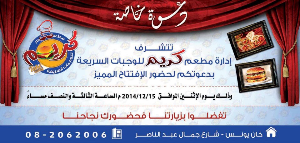 الرئيسة/إعلانات /خان يونس- دعوة لحضور إفتتاح مطعم كريم إعلانات خان يونس- دعوة لحضور إفتتاح مطعم كريم تاريخ النشر : الأحد | 14-12-2014 | 08:50 12745 بسم الله الرحمن الرحيم خان يونس- أول شارع الكلية، بجوار مدرسة حيفا للبنات، (مطعم السماك سابقاً) يمكنك تلقي أحدث الأخبار أول بأول بانضمامك لإحدى مجموعات الواتساب الخاصة بالعائلة من خلال الضغط هنـا اظهر المزيد