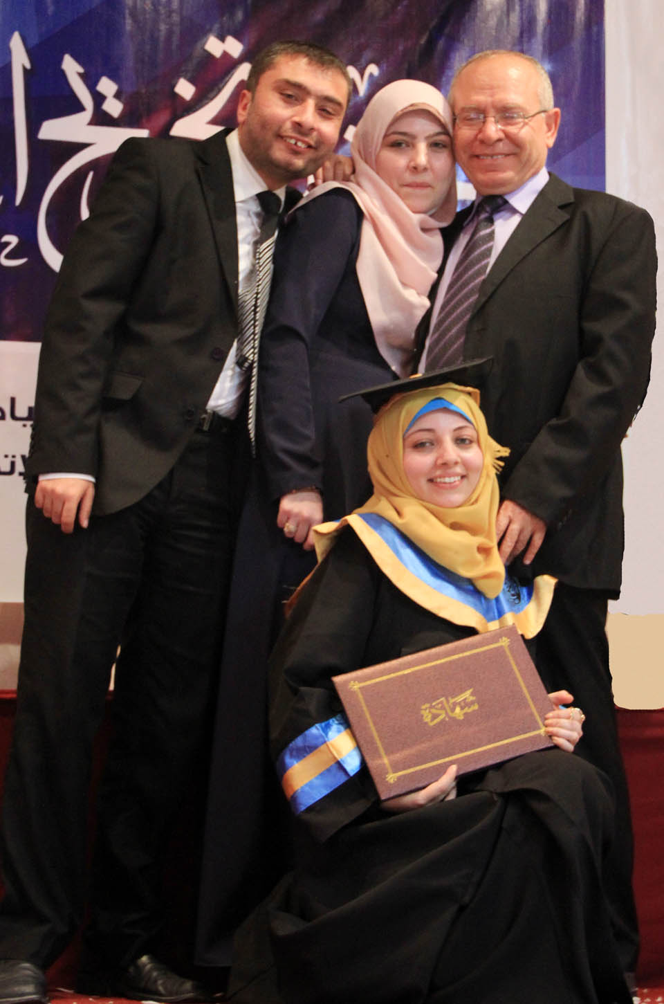 الخريجة وشقيقها براء، والد الخريجة، أ. عمر عودة الأغا، أ. كمال رمضان(عم الخريجة)