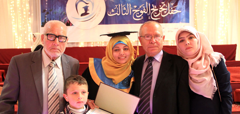 د. عبدالفتاح رمضان الأغا(والد الخريجة)، الخريجة دعاء، براء(شقيق الخريجة)، أ. عمر عودة الأغا(جد الخريجة)،