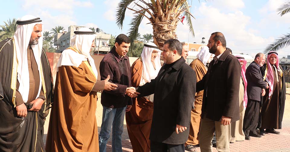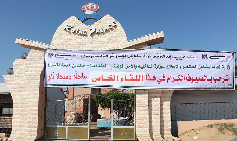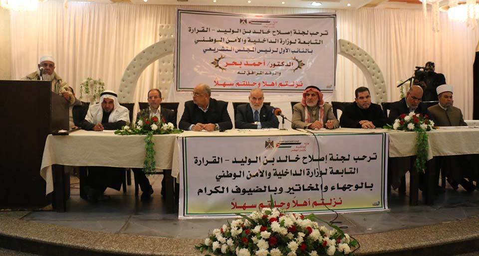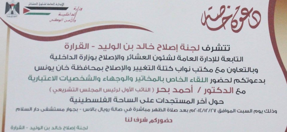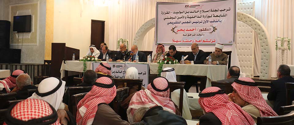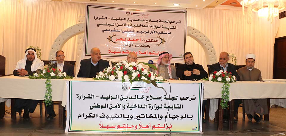 خان يونس- السطر الشرقي- صالة رويال بلاس- القاعة الملكية- السبت الموافق 27/12/2014- استقبلت صالة رويال بالاس رئيس المجلس التشريعي بالإنابة د.أحمد بحر وبرفقته نواب المجلس التشريعي من كتلة التغيير والإصلاح عن محافظة خان يونس، وجاء ذلك بترتيب من لجنة إصلاح خالد بن الوليد بمنطقة القرارة التابعة لدائرة شؤون العشائر والإصلاح بوزارة الداخلية والأمن الوطني.