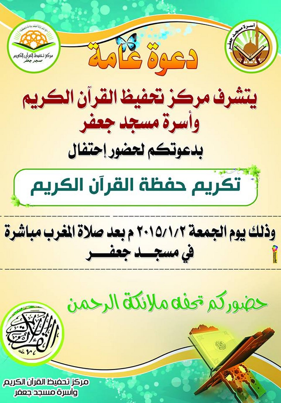 خان يونس- السطر الشرقي- مسجد جعفر- لأنهم حفاظ القرآن الذين أبو إلا أن يعكفوا على حفظ كتاب الله لأنه الجيل القادم الذي سيحرر المسجد الأقصى بإذن الله، لأنه جيل القرآن، يتشرف مركز تحفيظ القرآن وأسرة مسجد جعفر بدعوتكم لحضور الحفل السنوي لتكريم حفظة كتاب الله وحفظة الأجزاء ننتظركم بإذن الله يوم الجمعة القادم 11ربيع أول 1436هــ هجري الموافق 2 -1-2015م بعد صلاة المغرب مباشرة بالمسجد حضوركم دعما لمسيرة القرآن العظيم فكونوا معنا ........... بارك الله فيكم.