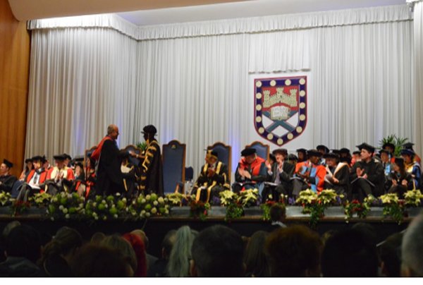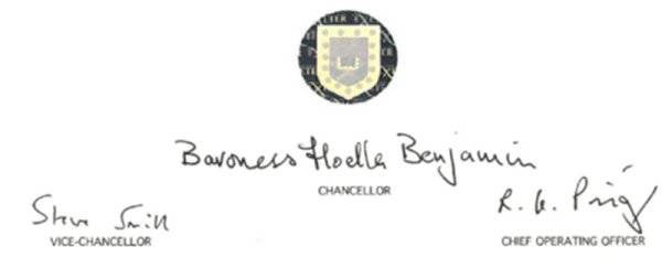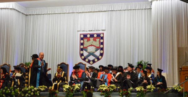 أثناء التكريم من قبل رئيسة أمناء جامعة إكستر البارونا فلورا بنجامين