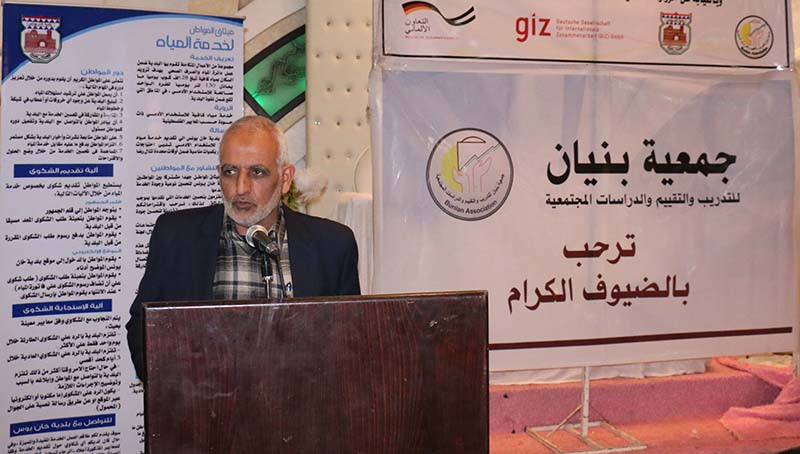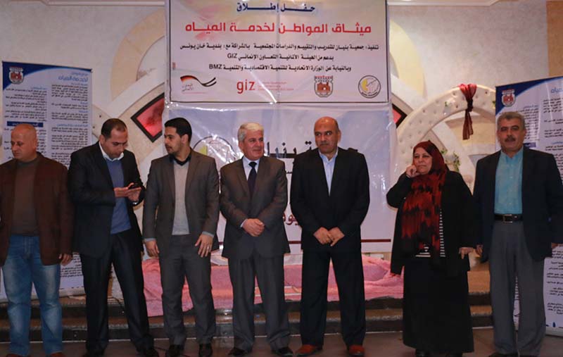 خان يونس- السطر الشرقي- صالة رويال بلاس- الإثنين الموافق 26-1-2015- جمعية بنيان للتدريب والتقييم والدراسات المجتمعية تقيم حفل إطلاق ميثاق المواطن لخدمة المياه بالتعاون مع بلدية خان يونس وبلدية بني سهيلا وبلدية لقرارة ، وحفل إختتام مشروع تعزيز أليات المساءلة الإجتماعية- المرحلة الثانية.