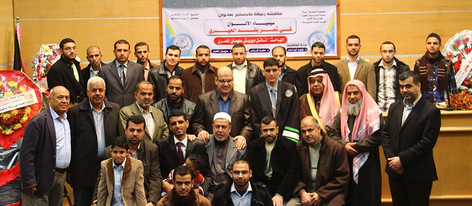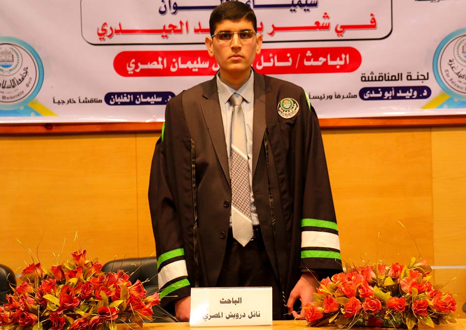 الجامعة الإسلامية- خان يونس- عمادة الدراسات العليا- كلية الأداب- قسم اللغة العربية حصل أ. نائل درويش سليمان المصري على درجة الماجستير وكانت بعنوان سيمياء الألوان في شعر بلند الحضري، وألف مبارك.