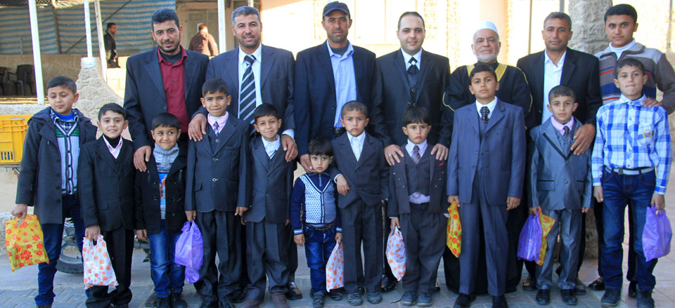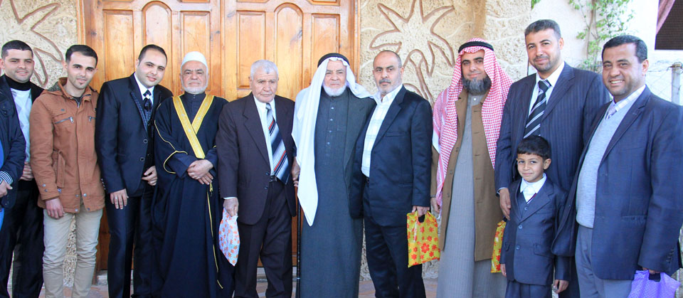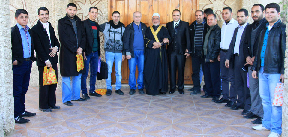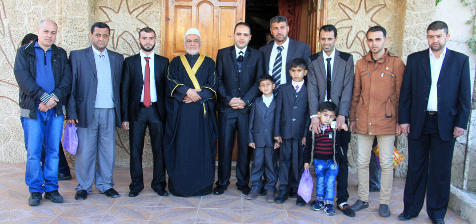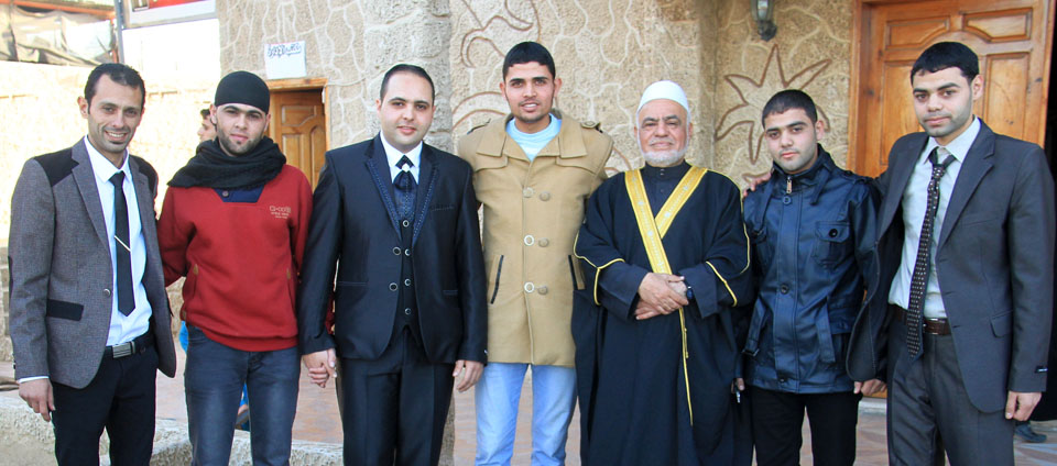 أ. بهاء رمضان الأغا(خال العروس)، الشيخ تميم شبير، أ. صلاح رمضان شبير ووالده، أ. فخري شبير، والد العريس، العريس، أ. ماهر شبير