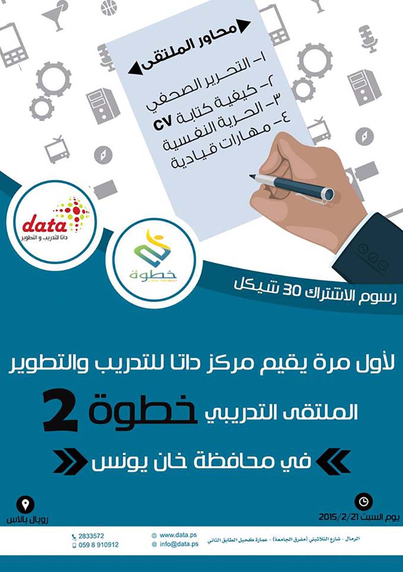 أول مرة في محافظة خان يونس الملتقى التدريبي خطوة(2 )، برعاية مركز داتا للتدريب والتطوير، يوم تدريبي كامل من الساعة 9 صباحاً للساعة الثانية عصراً.