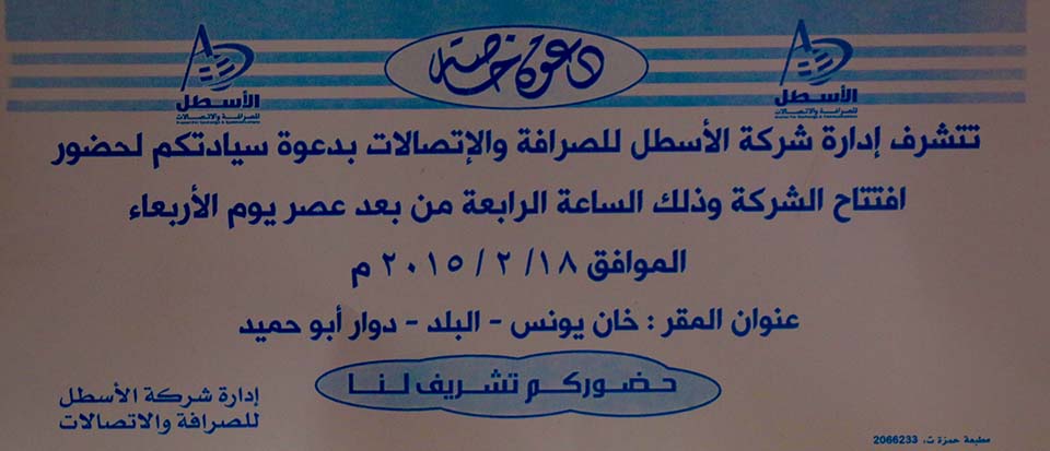 تتشرف إدارة شركة الأسطل للصرافة والإتصالات، بدعوة سيادتكم لحضور افتتاح الشركة وذلك الساعة الرابعة من بعد عصر يوم الأربعاء الموافق 18-2- 2015م