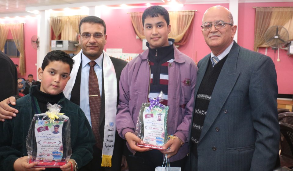د. وفيق حلمي الأغا وزوجته ونجليه المتفوقين محمد وحلمي، أ. رياض هاشم الأغا وزوجته أم هيثم