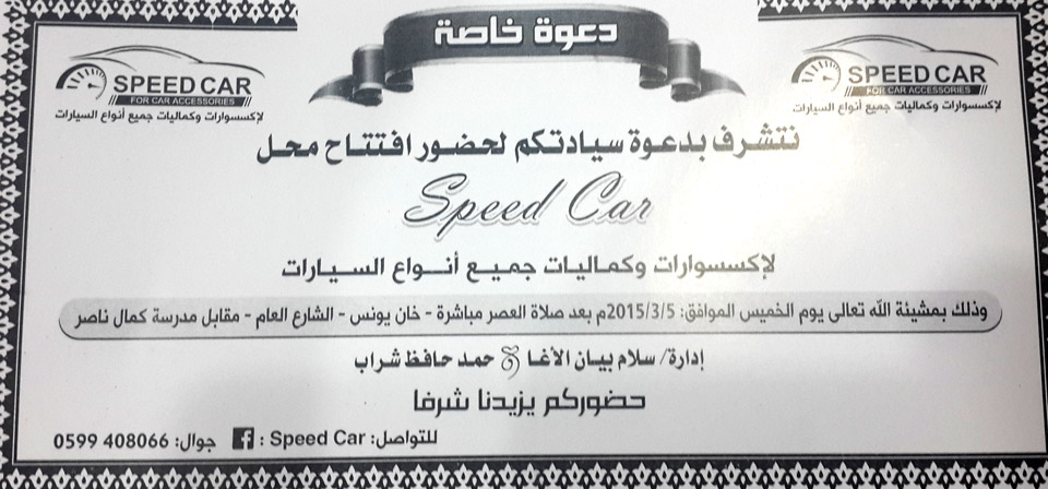 يدعوكم حمد حافظ شراب، وشريكه سلام بيان الأغا الى حضور افتتاح محل سبيد كار للاكسسوارات وكماليات السيارات، وذلك بعد عصر يوم الخميس الموافق 5-3-2015، حضوركم يشرفنا.